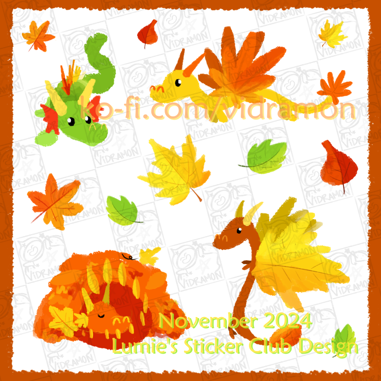 • Here is my sticker sheet for my Lumie's Sticker Club tier for November! I am in love with these leafy dragons and I want to put them on everything! Autumn is my favorite season, but we don't get much of it here where I live. If you'd like to receive these in your mail at the end of the month, join on my [ko-fi page](https://ko-fi.com/vidramon/tiers)!