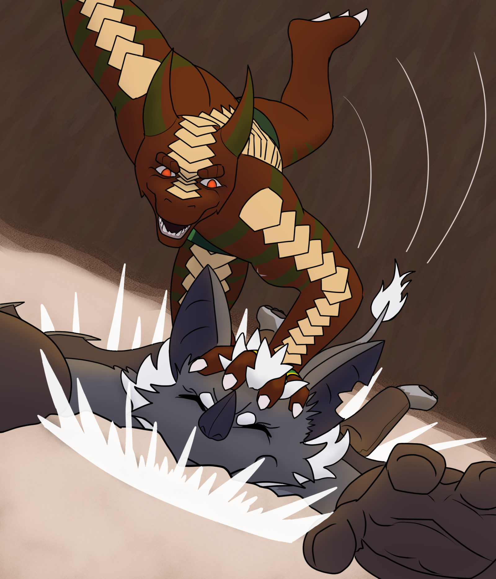 _"The warrior bat shrugs off the knee in just a moment, and oh would you look at the terrifying fury on that face! He barrels down at the dragonborn, and—ooooh, blazes, eats a mouthful of sand as Golalud slams him to the ground!"_ _"Vauruk kicks back, buys space, and up he gets! Known for his tenacity, that one. But you can see it, he knows he'll have to think of a different strategy if he wants to get at Golalud—and here he comes!"_ ------ This is a page from a comic that [WolfMirage](https://inkblot.art/profile/wolfmirage) and I did for ArtFight 2023. It stars my bat boy Vauruk the Formidable and [WolfMirage](https://inkblot.art/profile/wolfmirage)'s Kaldov Golalud. We intend to upload the pages of this series cooperatively, alongside the accompanying writing, over the next few days. The content will include violence and mild gore, and pages containing the latter will be tagged as such when warranted. [|< FIRST](https://inkblot.art/post/nTqClAoFQNLQE8Ly55bb) | [<< PREV](https://inkblot.art/post/QbmyKbgl8yYgC2ctZ1Ys) | (Page 4) | [NEXT >>](https://inkblot.art/post/H6KCL9sdR8gwPXqRhx5c)