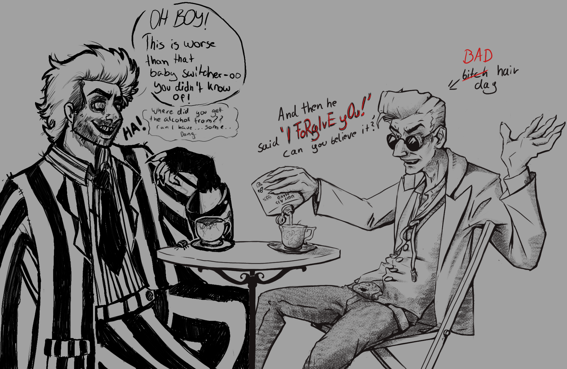 When your demon buddy visits from the Netherworld. It's the last day of the Beetlejuice musical on Broadway, so this is my way of mourning. Based on a screenshot from S1E9 of the animated series.