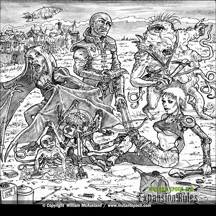 • Yet More Mutant Epoch Freaks from the new Expansion Rules book. This ink image is from page 9 and from left to right shows a bestial human bat lady, a parasite on the ground without its host body, a vat brain in a crab legged walking machine, an android warrior on guard behind them. In the background is an abomination. Seated and getting repaired is a rebuilt human character. Rebuilt are sort of like cyborgs but made useful to their community by being augmented from scrap and junk, often by some weirdo called a junk doctor. and have a pretty tough life in an already screwed up, dangerous world.