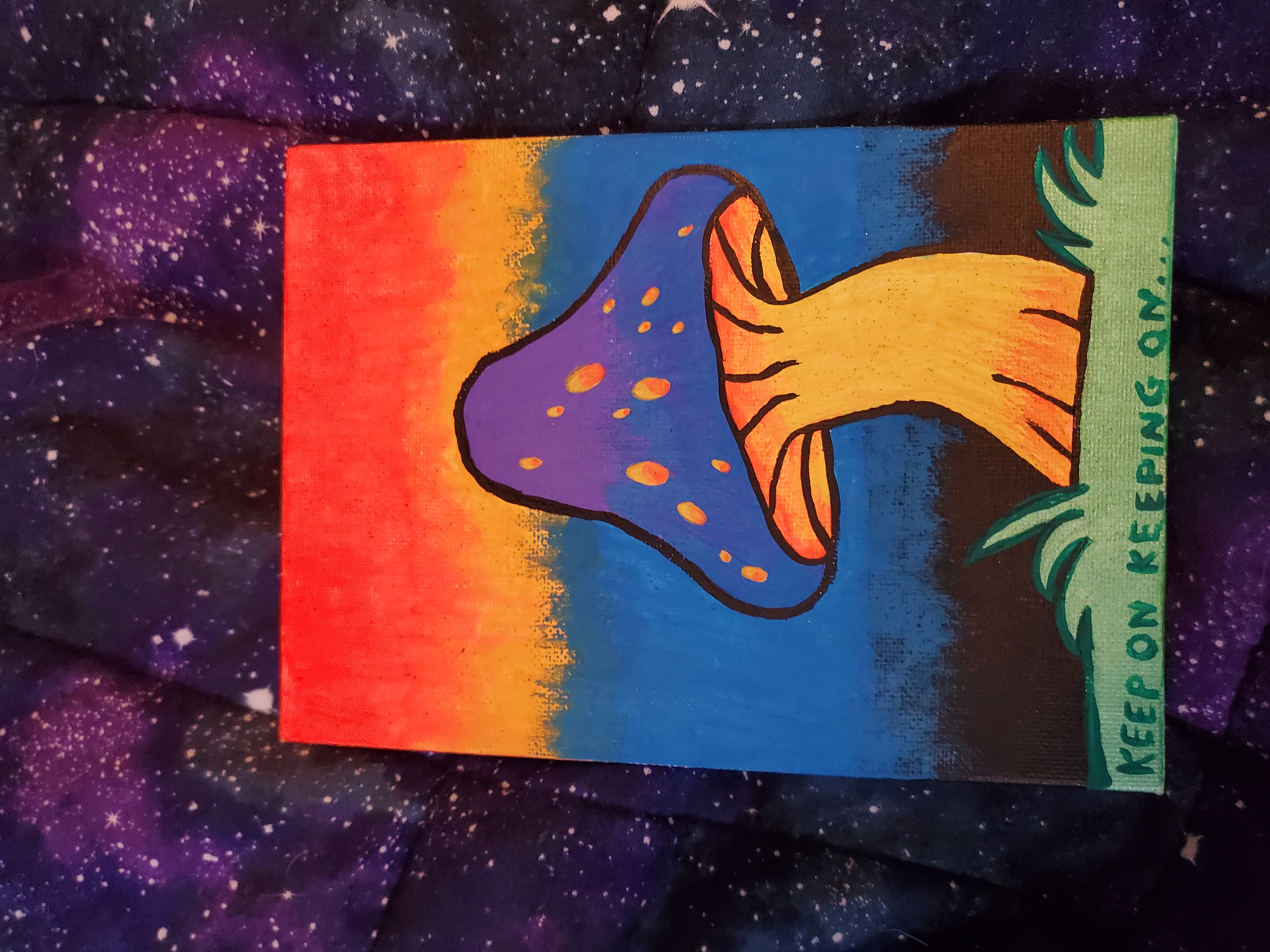 Therapy art pt 5. Lil shroomie for my wall. Really liked the neons the clinic had. Lit up well under my blacklight! So that was a pleasant (not so surprising) surprise.