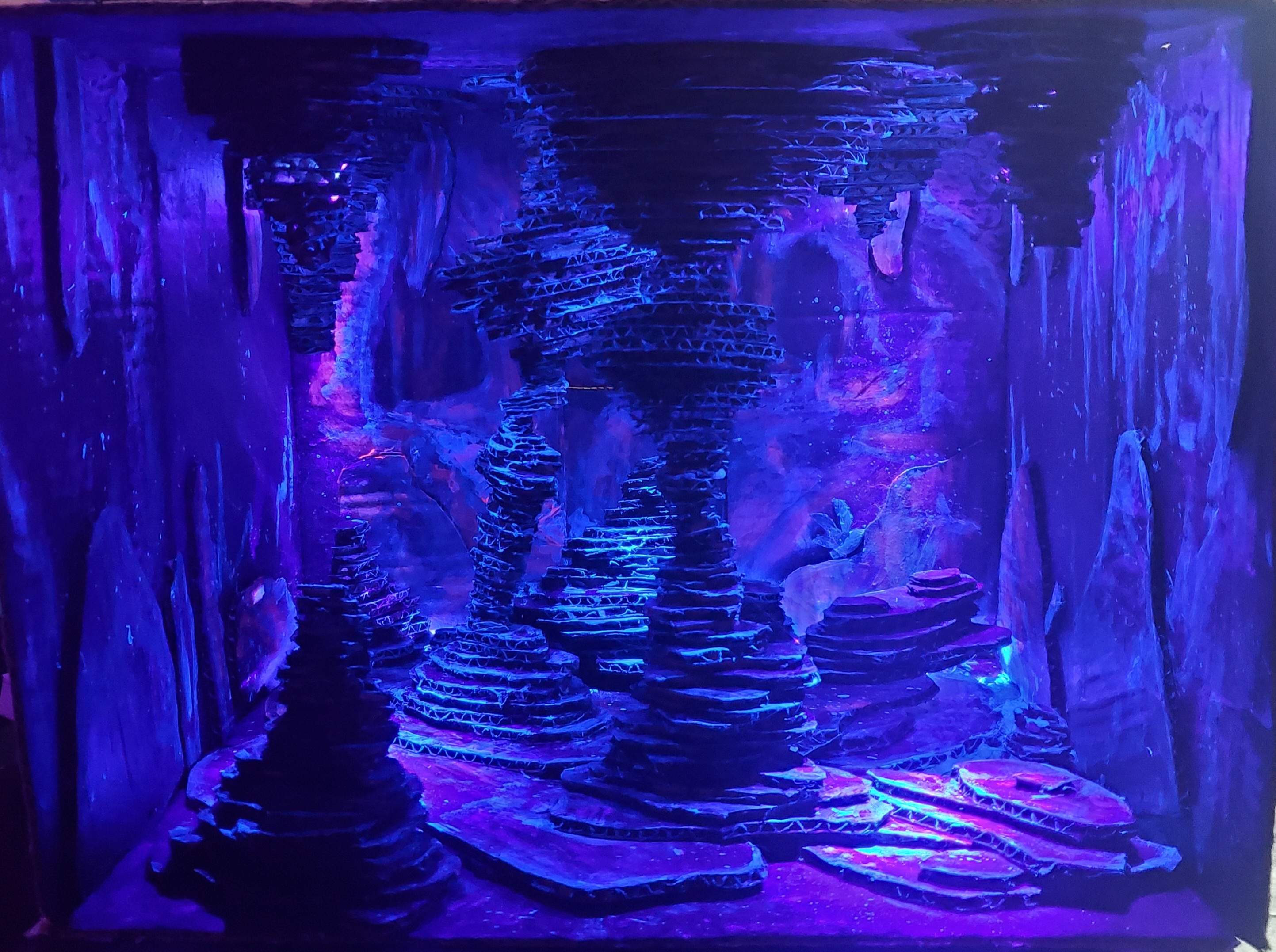 • First proje t for my 3d design class using cardboard, paint, n blacklight leds for this relief landscape sculpture