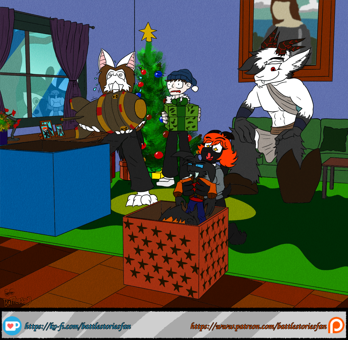 BEHIND THE SCENES SKETCH, FULL RESOLUTION AND TIMELAPSE IN MY SUPPORT PAGES It is Christmas! Or rather it WAS christmas, since this pic is a week late as usual...Hey, It's not me if I don't upload something late as hell, right? And I got rather busy with christmas parties, new year celebrations AND a birthday in basically the same week, so yeah, got busy! It's Christmas morning! Jackie, Tag and Blight have just been given their gifts by good old Abraham, and while Tag hasn't opened his gift yet, it'll no doubt he completely overshadowed by the other 2! Wonder what they're gonna do with their gifts....Why's Bumble outside, you mean? Cuz he's in timeout! Done over the course of 5+ hours, reference modelled in blender, drawn in krita and timelapse done in KDENlive! Enjoy! More stuff here! https://linktr.ee/battlestoriesfan