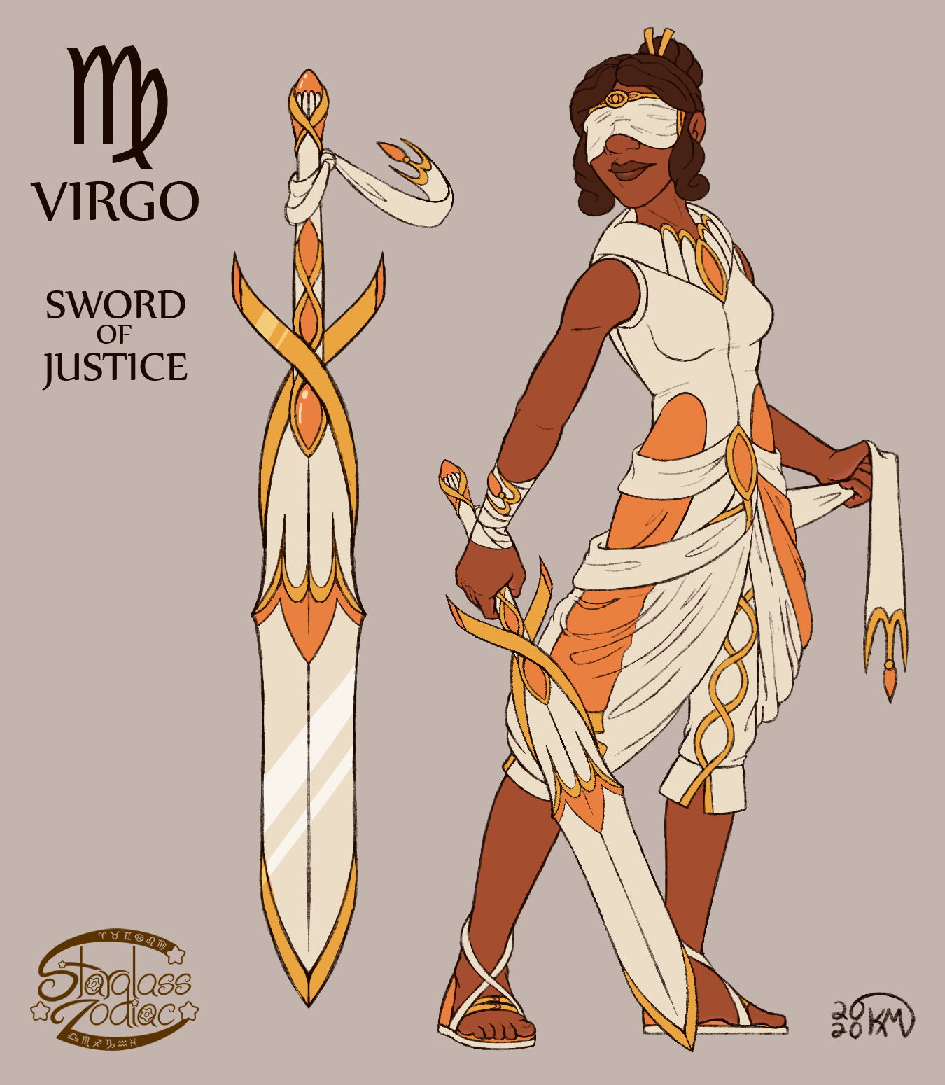 **Originally Created On:** January 21st, 2020 Felt like drawing more swords!!! Though really that’s a constant mood for me. xD I’ve done a few versions of Virgo’s sword before, but I was never totally satisfied with them, either from an aesthetic or functional standpoint. Obviously there’s a bit of leeway when it comes to functionality in fantasy weapons, but I also want my designs to suit the wielder as best as possible, so I took another swing at this one (ha). I think I finally matched the balance of elegance and power of Virgo herself for the sword’s design, as well as finding ways to better incorporate her symbol. What you’re seeing here is essentially Virgo’s “battle mode”, where she cinches her dress for better mobility. She always fights while blindfolded, borrowing from the phrase “justice is blind”.