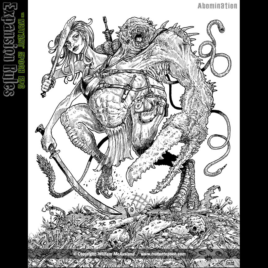 Abomination Art from page 25 of The Mutant Epoch RPG Expansion Rules book Originally grown in vats, abominations are mutant miscreations who were designated with alpha-numeric identities: a mix of manufacturer’s code, batch number, purpose, and quality and were initially mindless, group thinking, slavish followers of a collective. Those gifted with fertile genitalia bred with other foul, unlikely scientific mistakes and oddities to form a new line of independently minded creatures. The name ‘abomination’ seemed to stick, however, instead of their product ID, and in time, even their creators called them by the name they are now known by. Civilians, politicians and activists had less flattering names for these life forms, especially once these fleshy brutes began to see deployment against enemy troops, street mobs, rioters, mutants and other entities. Present day scribes and researchers have uncovered only a few pre-collapse names for these ghastly miscreations, such as blobs, rubber devils, fleshies, globulurs, gobbies, dough monsters, and flesh puddings. Check it out here: https://www.outlandarts.com/expansionrules.htm