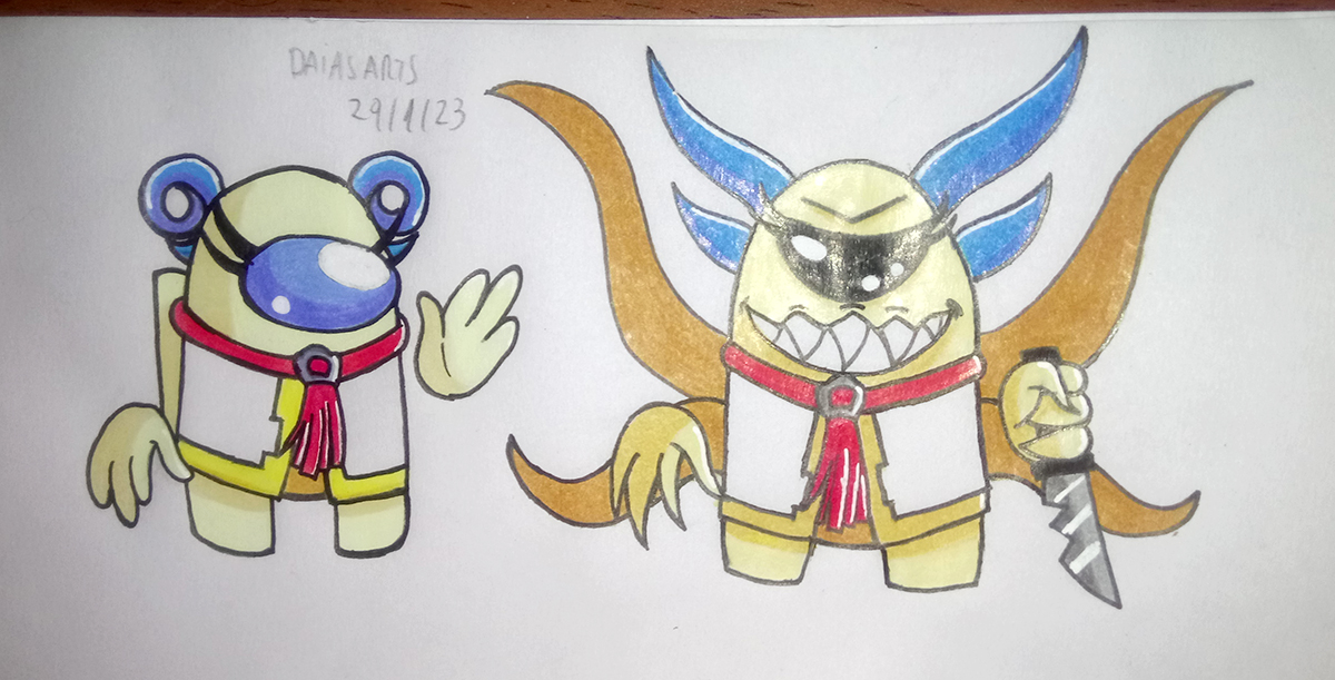 Drawing of my pngtuber avatar as an among us which became my among us oc. Left is crewmate versión while the right one is imposter versión.
