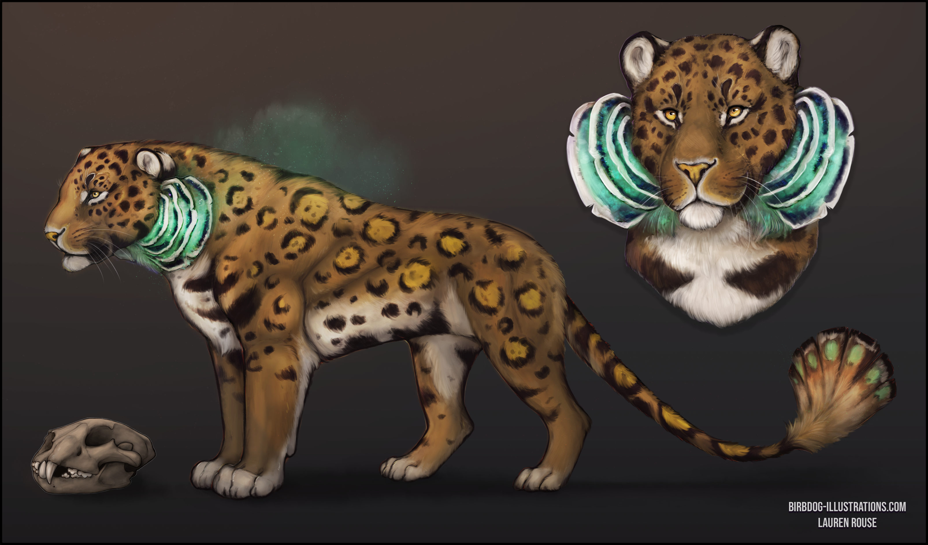 Female Variant of the Crested Jaguar, a Creature I designed for my worldbuilding project in University of 2020, also a current encounter for my DnD Campaign project! ------ _''Crested Jaguars are a very large mammal from the genus ‘ Panthera’, named for their large fin-like crests either side of their necks and large rosettes covering most of their body. Some can say they resemble a large hybrid between a peacock and a leopard due to their colouration and feathered fan tail. Sexual Dimorphism in the sexes are extreme. Females are generally much smaller compared to the males, reaching 6ft at the shoulder. Their pelt colour is a selection of browns, faun and oranges, while their skull shape is more round and short compared to their male counterparts. The males are much larger and stockier than the females, at 8ft at the shoulder, their coats are generally a mix of blues, greens and orange, with a large peacock-like tail feather. A male’s coat colour is most likely used for attracting mates, though this is a theory as this species is very elusive and a live male has not been seen in person in about 100 years. A Crested Jaguar’s limbs make it adept to climbing, crawling and swimming, their skulls are robust and the jaw extremely powerful, rumored to be able to pierce through even the strongest of armour, which makes these cats incredibly dangerous and deadly. Their range is very limited in the valley of Roanoak, usually a large male will have a large territory with several females in. Arcgate ruins is said to be the home to a large male for years, the individual is so elusive it has been described as being mythical, a silly urban legend to tell at bedtime stories. However, evidence such as prints, claw marks and scat have been found, proving it is indeed real. Though no one has been brave enough to venture into the ruins.'' _ **Photoshop CC - Wacom Cintiq 16**