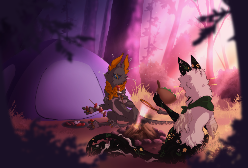 Creatures going camping! I feel like Ventura and Mimosa are really friends at this point. Finally got my time to let Ventura use their magnifying glass tail as a light!