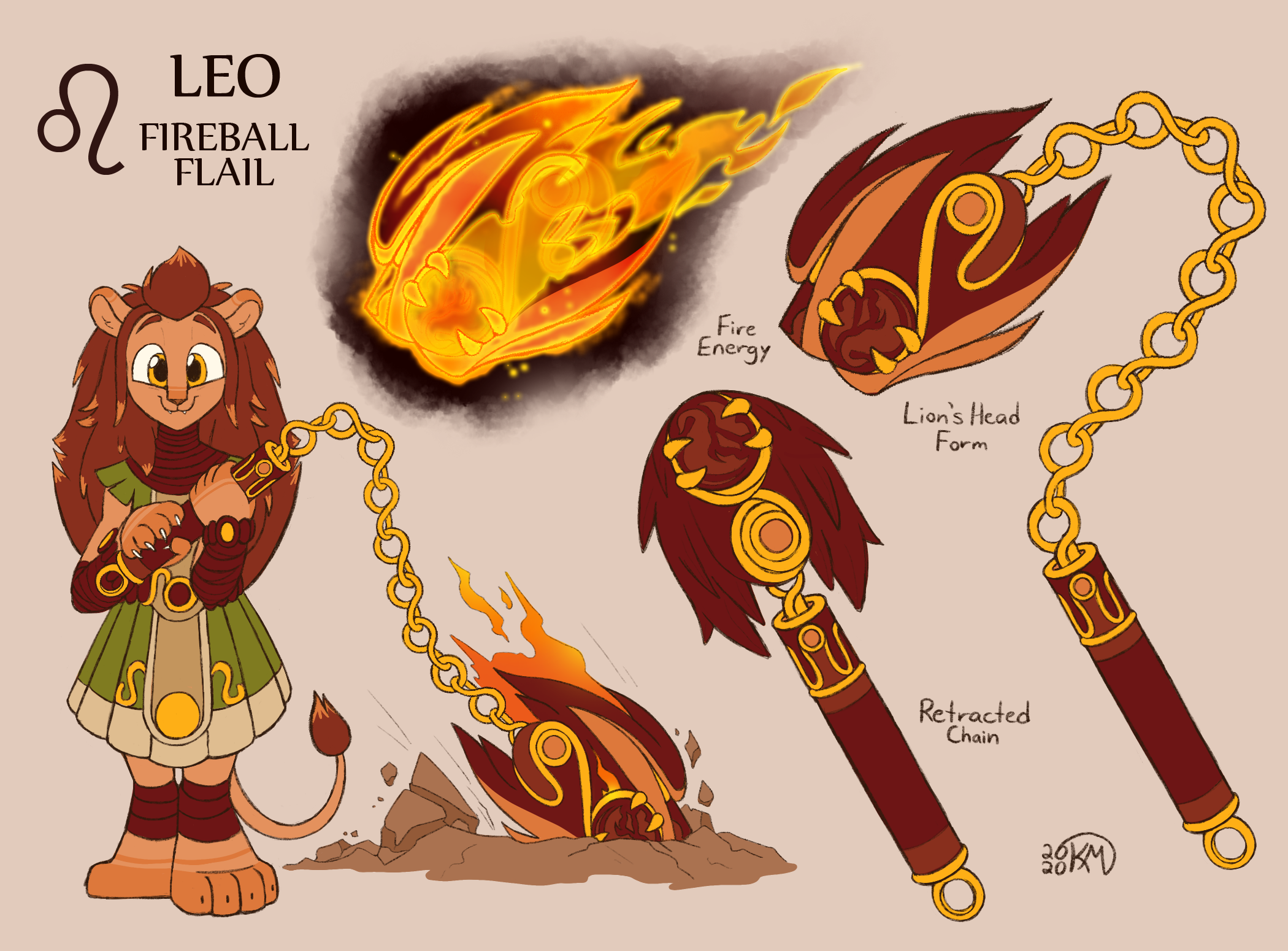 **Originally Created On:** January 28th, 2020 Another weapon update, for Leo this time! ^_^ I know the “cute character wielding a scary weapon” trope is well-used at this point, but I still love it a lot. xD  I don’t totally know how I want to do the fire effects for this weapon yet, and I guess the flat colour doesn’t really tell you what the flail is made out of, but this was still a good update! Like Virgo’s updated weapon design, I wanted to make sure I captured the personality and “theme” of the wielder as best as possible, as well as adding some much needed detail / symbol integration. The design of the head might change a bit depending on if I can draw it well enough from other angles, but the idea is there at least. The flail can be lit in both its retracted and lion head forms, but the latter is more common. Similar to Capricorn’s whip (which might also get an update in the future), the small button on the side of the handle allows it to retract / release. Leo can also use her fire magic to light her own mane on fire to match the flail for more close-combat attacks!
