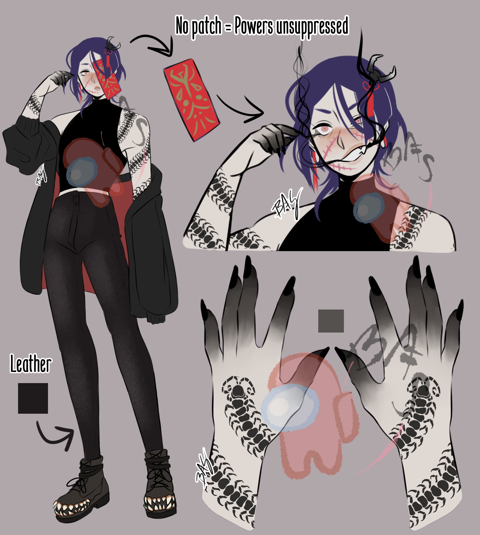 • He's so precious even if he's feral So far what I got for him is that he's in love with himself along with his boss, he's very delusional and a killing machine. Also I'm thinking his centipede tattoos kinda act like Medusa's snakes from Soul Eater, but we'll see how that plays out.
