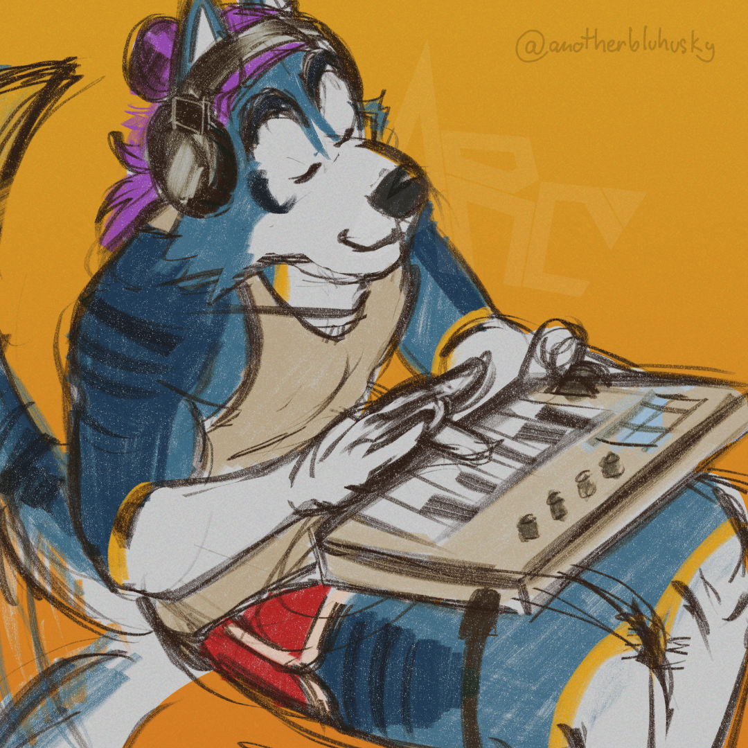Drawing of a blue and white anthropomorphic husky happily sitting down, wearing headphones, and playing a MIDI keyboard.