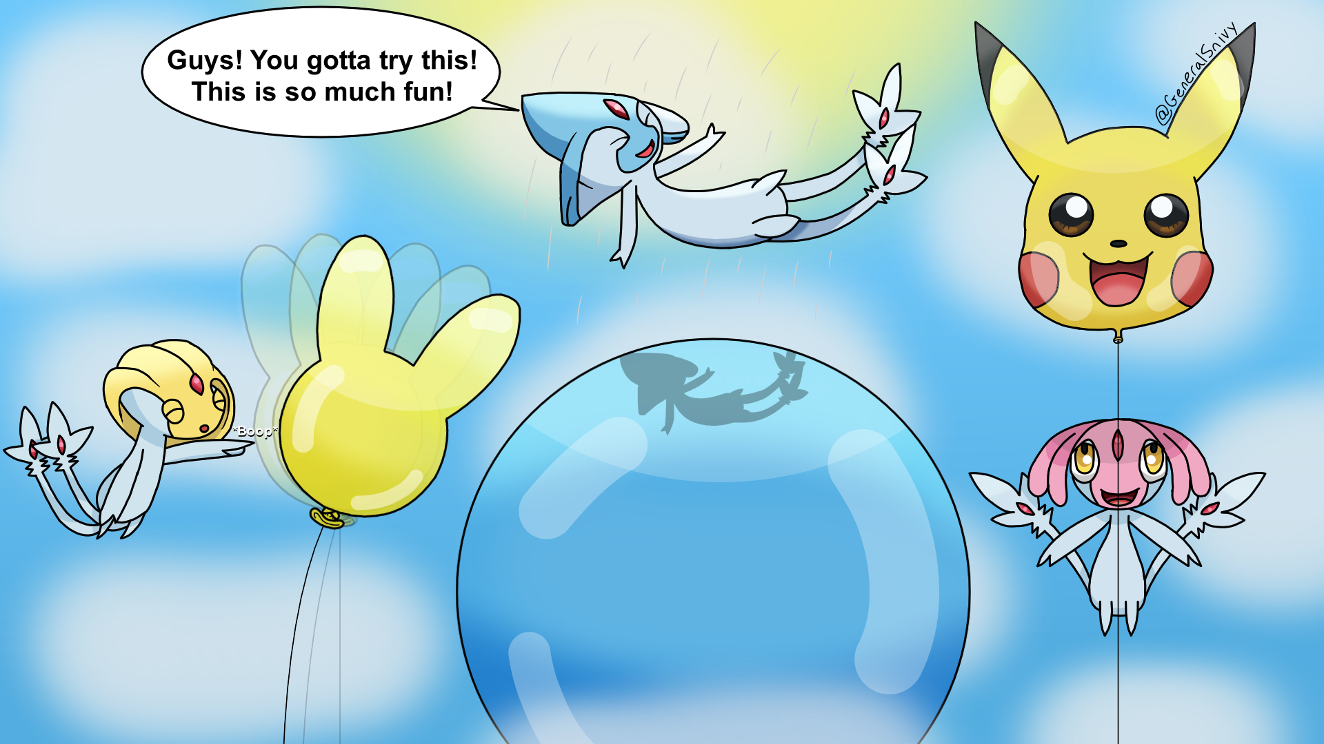 • The guardians of the lakes in the Sinnoh region, Azelf, Mesprit, and Uxie, show their curious side as they examine and become fascinated with one of human's creations; balloons. Their fascination stems from the fact that not only do they come in all different shapes and sizes, but also, how they effortlessly fly/float in the air. Plus, they are a lot of fun to play with, or in the case of Azelf, bounce on.