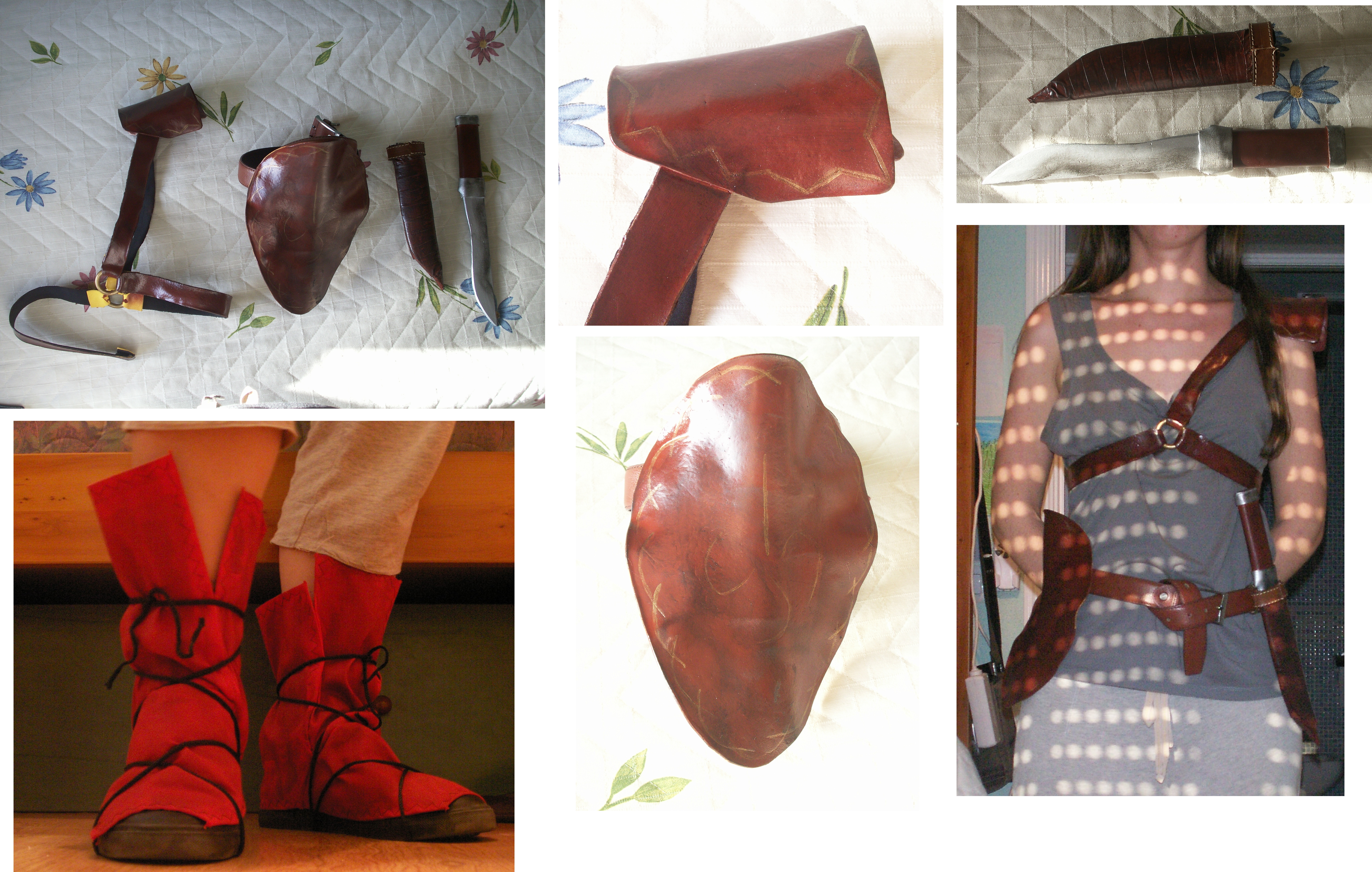 Stuff made with false leather (save for the boot covers, which are made of fabric) that I crafted as part of a costume for a huge medieval market which is set up in my city every year (in fact it's the biggest medieval market in all Spain and one of the biggest in Europe). Save for the brown paint I didn't buy any materials, it's all stuff I already had. And those are my pyjamas by the way so obviously not the clothes I wore this with xDDDD Materials: -eva foam -wood (for the dagger) -yoga mat (for the dagger's sheath) -Asch cosplay's belt -another random belt I found (and had previously destroyed to make the loop on Mjölnir for my Thor cosplay) -curtain rings -insulating tape -black and red fabric -black and brown shoe cream -gold, silver and brown paint -different adhesives depending on my patience with each piece -black cords.
