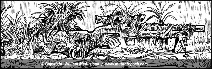 As their name implies, these stealthy, modestly sized units appear as males or females of exceptional fitness, although not large and so are more easily able to blend in with a civilian population. Masters of camouflage, concealment and marksmanship, these deadly units make for exceptional new era excavators. Each has 1d4 skill points in each of the following skills: stealth, Lock picking, tracking, climbing and the sniper skill. 77% of these units have built in standard communicator in their heads and like the covert android, can carry on conversations within their head with other operators without being heard by nearby personnel. Sniper androids have built in telescopic vision with which they can see 40 times further than a human by day and 10 x further at night, with advanced night vision optics built into their eyes. Ink illustration for page 42 of The Mutant Epoch RPGs Expansion Rules Book. Learn about this game book at https://www.outlandarts.com/expansionrules.htm See an YouTube overview video here: https://www.youtube.com/watch?v=NmR1zStcU38&t=69s
