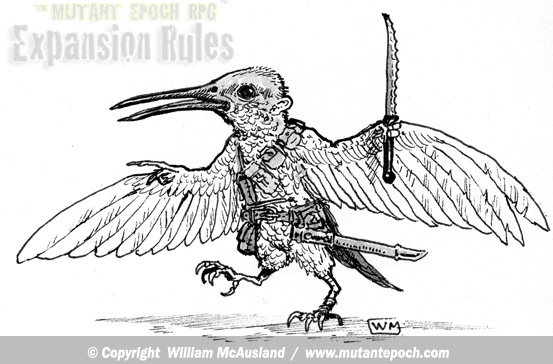 Bestial Human Hummingbird Hand drawn Ink art by William McAusland, writing by Colin Chapman The smallest of the bestial human birds, hummingbirds are hyperactive omnivores with a love of all things sweet. Though frequently sporting attractive plumage, their need to consume their own bodyweight in protein and sugars every day means they are constantly on the lookout for food and are considered undesirable guests. As a result, they are seldom welcomed into human communities even when accompanied by humans and human mutants, and must often be covertly carried into a settlement by slipping inside a large companion’s backpack and bedroll. Humanoid hummingbirds can fly with their wing-arms (28m per round) but cannot use their hands while doing so; their wings simply beat far too rapidly. They can use a weapon while in the air, but can’t flap their wings while doing so. If they stop, they will plummet to the ground at a rate of 10m per round. Watch a video intro of this new book at RPG Overviews on Youtube: