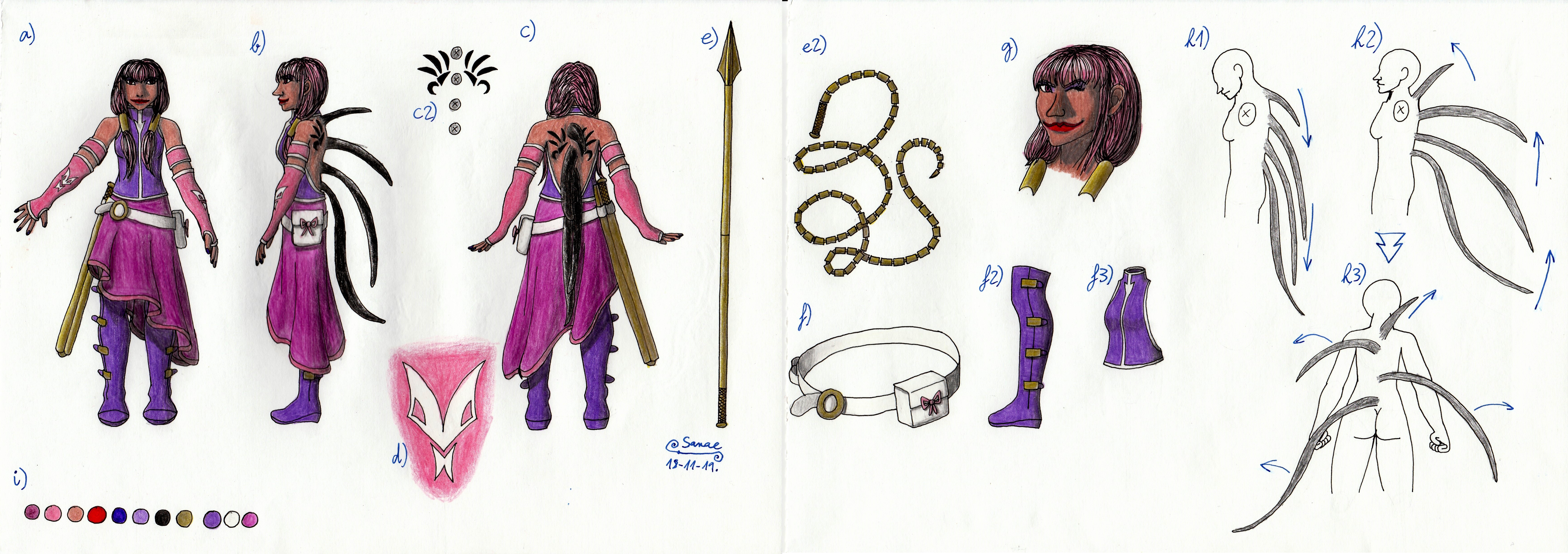 Meet Violante Malena, my child, OC for a RWBY role campaign. She is a lizard Faunus from Vacuo, likes hitting on pretty women, loves travelling and trying the local dishes, and hates racism and bread. Inspiration for this character came from the legend of the lizard of La Malena, AKA lizard of Jaén, a local legend from a city in the south of Spain. The lizard of Jaén was a huge monster that ate people's cows and sheep until someone got it killed. It's not clear who and how they did it: some say it was a shepard who fed it bread with gunpowder, other say the shepard hid gunpowder inside the carcass of a sheep, and others say it was a knight with his spear. Either way, they all agree on the lizard exploding in the end xDDDDD So Violante's semblance consists on making objects explode and her weapon is a spear that can turn into a whip. Now, let's see the details of this reference: a) Front full view b) Lateral view c) Back view with detail of her tattoo (c2) d) Detail of her emblem e) Weapon of choice: a spear that can turn into a whip (e2), it can also be folded in two (that's how she usually carries it when she's not fighting) f) Some details of the default outfit, including the belt, boots (f2) and top (f3). Most of her tops are backless, for obvious reasons. g) Detail of the head, make-up and hairstyle. She always wears make-up: a purple shade over her eyes and vivid red lips. h) Schematics of how her spines move according to her humour: h1) Low spirits, sadness, tiredness, sickness, spines go down h2) High spirits, she's inspired, happy, or hitting on someone, spines go up h3) When she is tense, or hostile, or feeling unwelcome, or wants someone else to feel unwelcome, spines go up and to the sides as if she's trying to look bigger and scarier. i) Colours used. Hope the scanner and the screen doesn't mess this up. Anyway, her colour is violet, so it's basically purples, violets, pinks and some gold and white for accents.