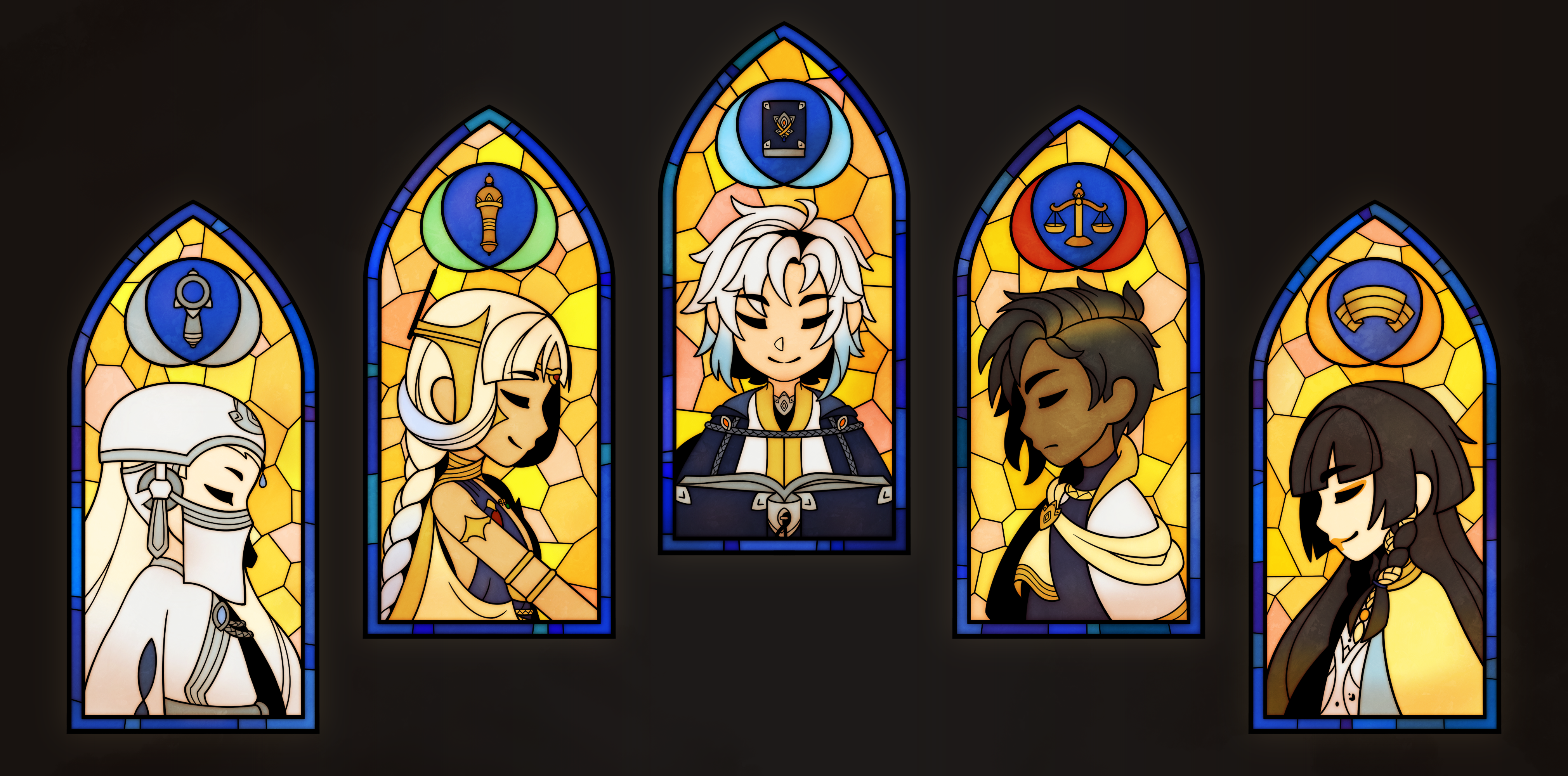 Okay, for today’s mandatory post, let’s keep up with these OCs! They have only 3 “big” drawings, so they’re the easiest to get through with haha These are stained glass depictions of the Five Gods and their Holy Artifacts. From left to right: * Talis, deity of Wisdom. Holy Artifact: the Lens of Truth. Grants deep understanding of whatever is seen through the lens. * Sinea, goddess of Conflict (the one I posted yesterday!). Holy Artifact: the Command Scepter. Bends human ambition to the user’s will. * Kazel, god of Fate. Holy Artifact: the Book of Fates. Contains an account of all that has happened and is to come. * Adair, god of Justice. Holy Artifact: the Heart Scales. Measures the fairness between the crime committed and the punishment served. * Lena, (fallen) goddess of Mercy. Holy Artifact: the Sacred Blindfold. While taking the wielder’s ability to see, it grants them insight into other people’s deepest emotions.