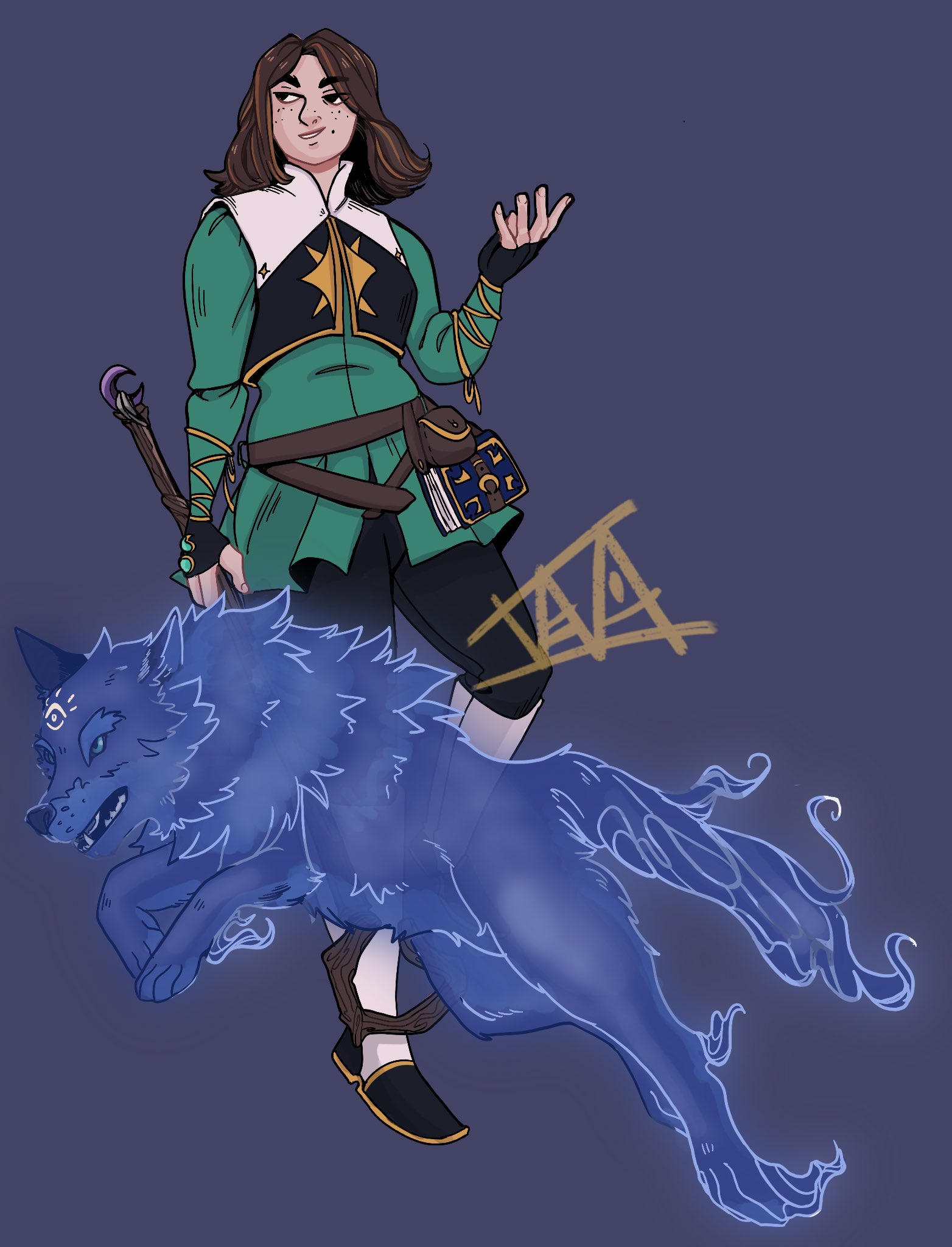 Myself as a dnd Wizard (college of scribes) who can summon ghost wolf familiar. This was actually done for a culminating presentation for a work leadership academy I was a part of. Explanation of Design choices: True Colors preferences--I have a preference for Green, then Blue with a little Yellow which decided the outfit colors. Hard to see but the weapon is a shepherds crook in reference to my love of sheep, the english translation of my last name, and the concept of a shepherd "leading" their flock Wolf spirits because our mascot is the grey wolf and I met a lot of new people across the college I work at to call upon Chose wizard and college of scribes because my strengths lean towards data/knowledge accumulation and sharing Fun enough, I was not the only one who used dnd in their presentation.