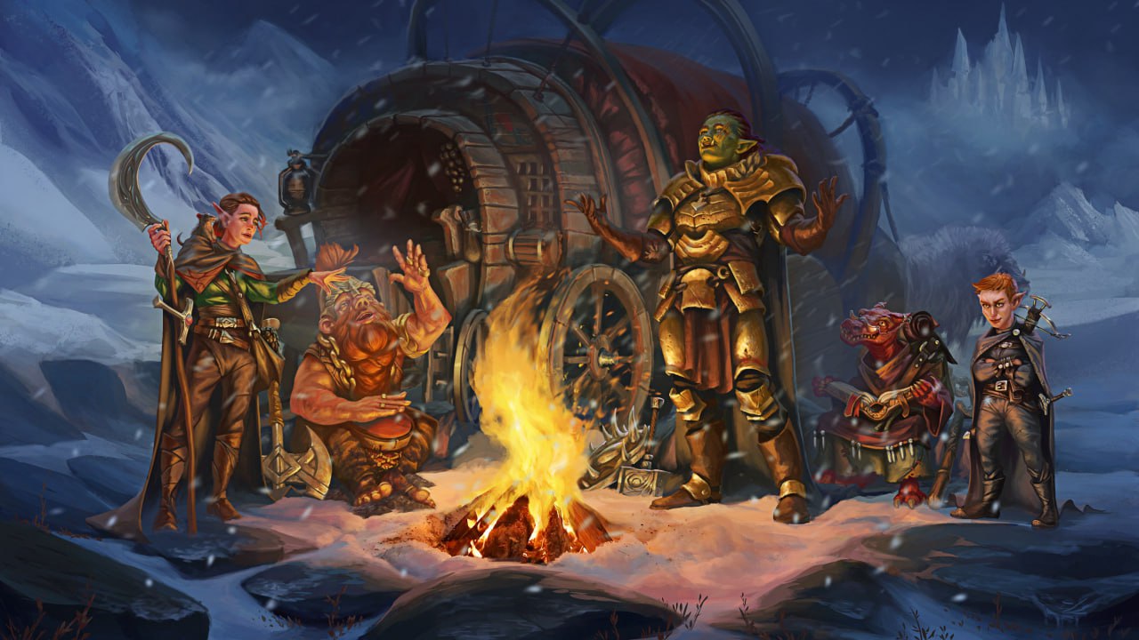• The group is sitting around a campfire at night talking and laughing with each other. There was a part of the campaign where the party were guarding a wagon and that is what the players like for the setting.