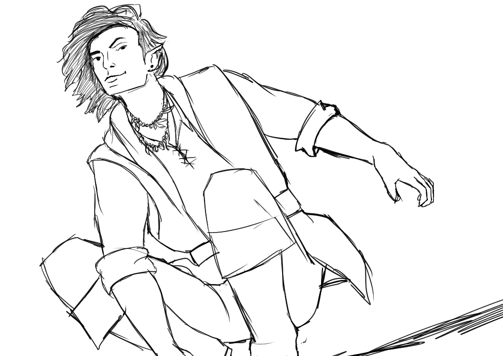 Fletcher is a Half Elf Rogue (a la DnD 5e), general bad boy and all around flirt. Cool as a cucumber in all situations. He's also a liar and none of that is true. Well, he is on the run from the law, and he is a thief, but he's far more of a giant ball of anxiety that is really really good at hiding it. More than anything, he just wants to find a friend that won't leave him behind.