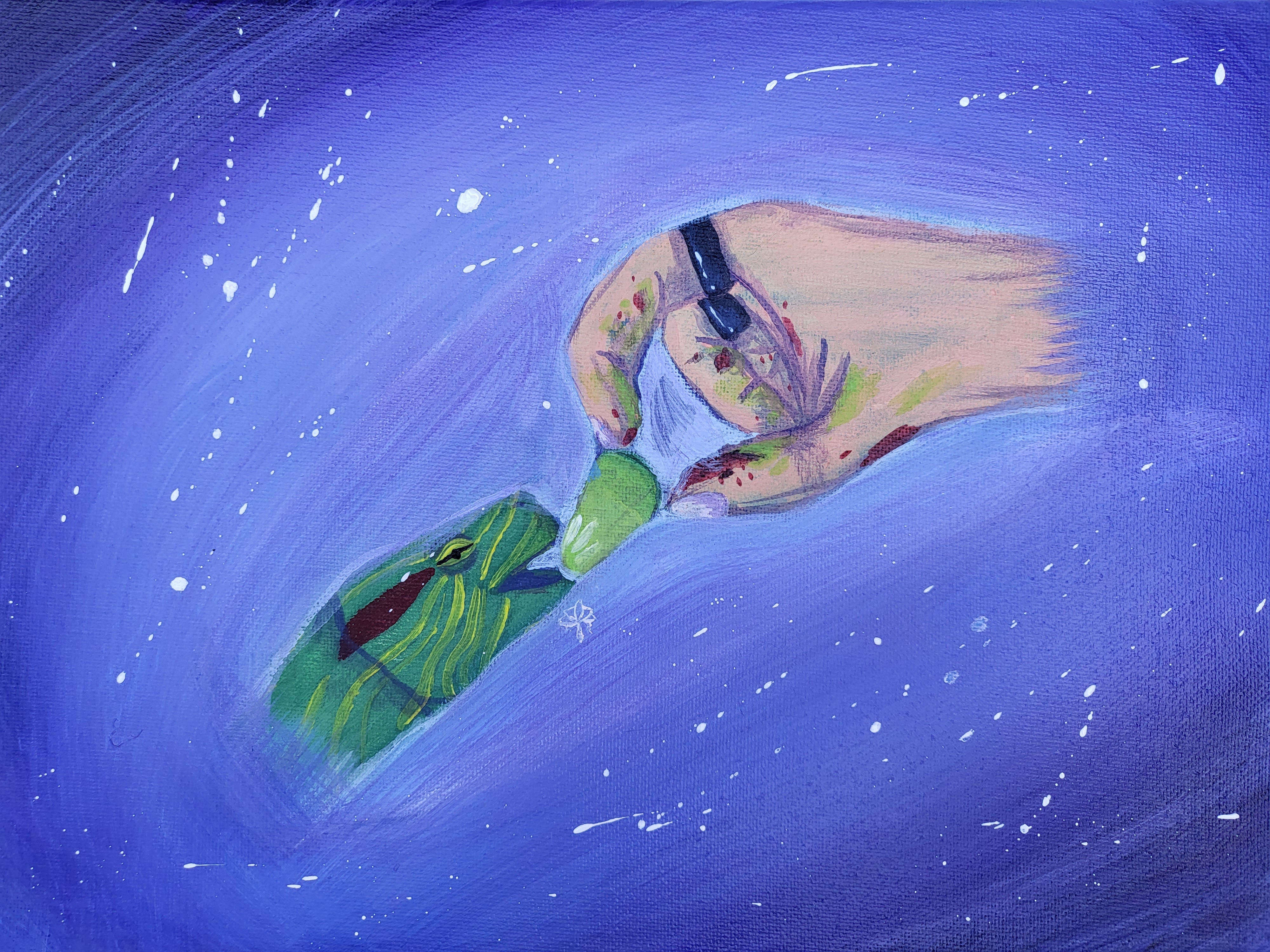 A painting done with acrylic and watercolor on canvas depicting an artist's hand feeding a red-eared slider turtle a piece of cucumber. The hand is covered in paint splotches that match the colours of the turtle and the swirling purple and blue background paired with vibrant colours give the painting a feel of a dream or memory. Gaining the trust of such a skittish animal to a point where one is able to feed them by hand is truly a magical experience and unlike anything I've experienced before.
