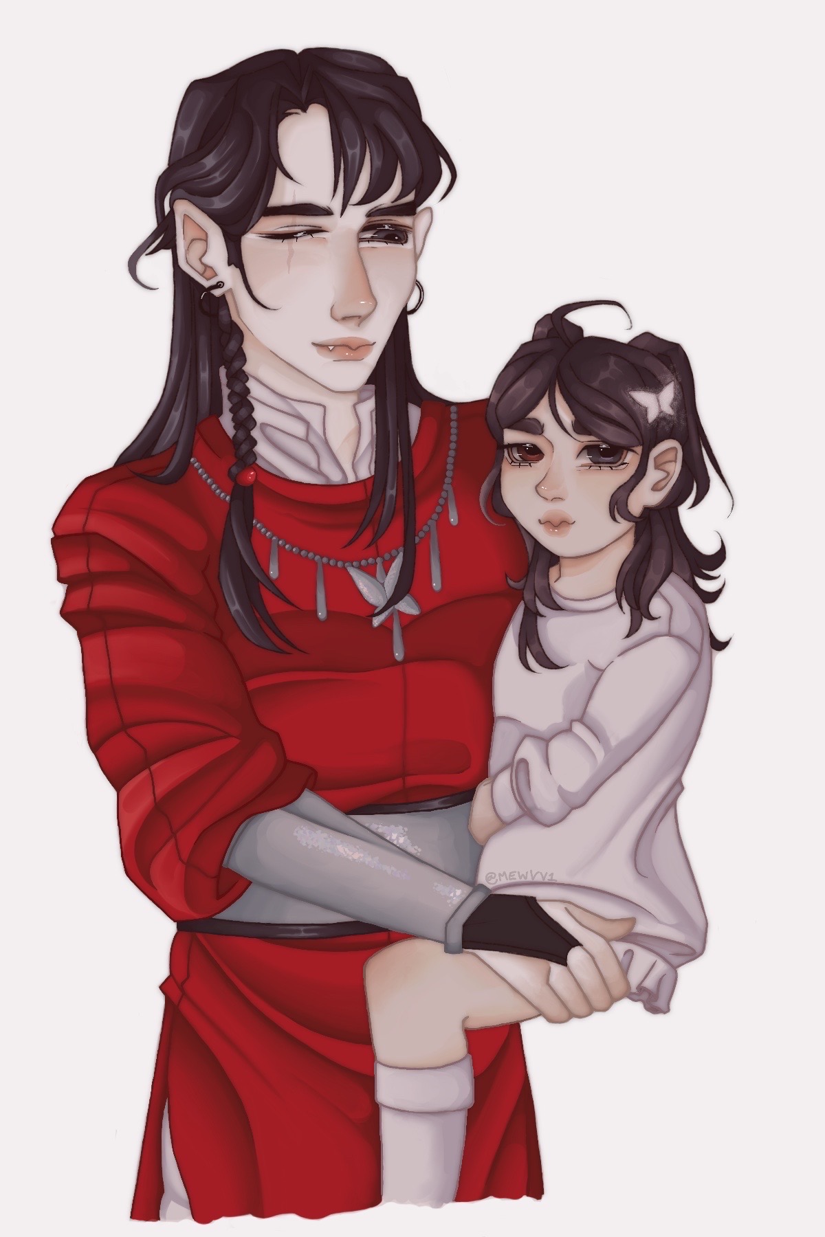 • Hua Cheng holding his daughter who is technically an OC since he doesnt have one in canon. Im obsessed with Hualian being dads so i just had to make them a daughter