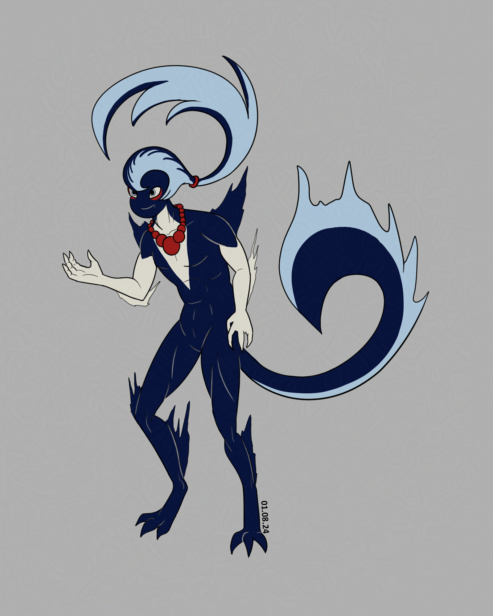 One of my most favorite custom designs I commissioned. Raymond, or Ray for short, is a Darkrai gijinka and he immediately gave me Hellsing Abridged Alucard vibes. He's not a vampire, and instead a human fused with a monster who controls dreams. He flip flops between being a snarky jerk and a quiet sweetheart, but he's mostly the snarky jerk. He does show his humanity towards people he's close with, and getting teased by him is one way he shows his affection.