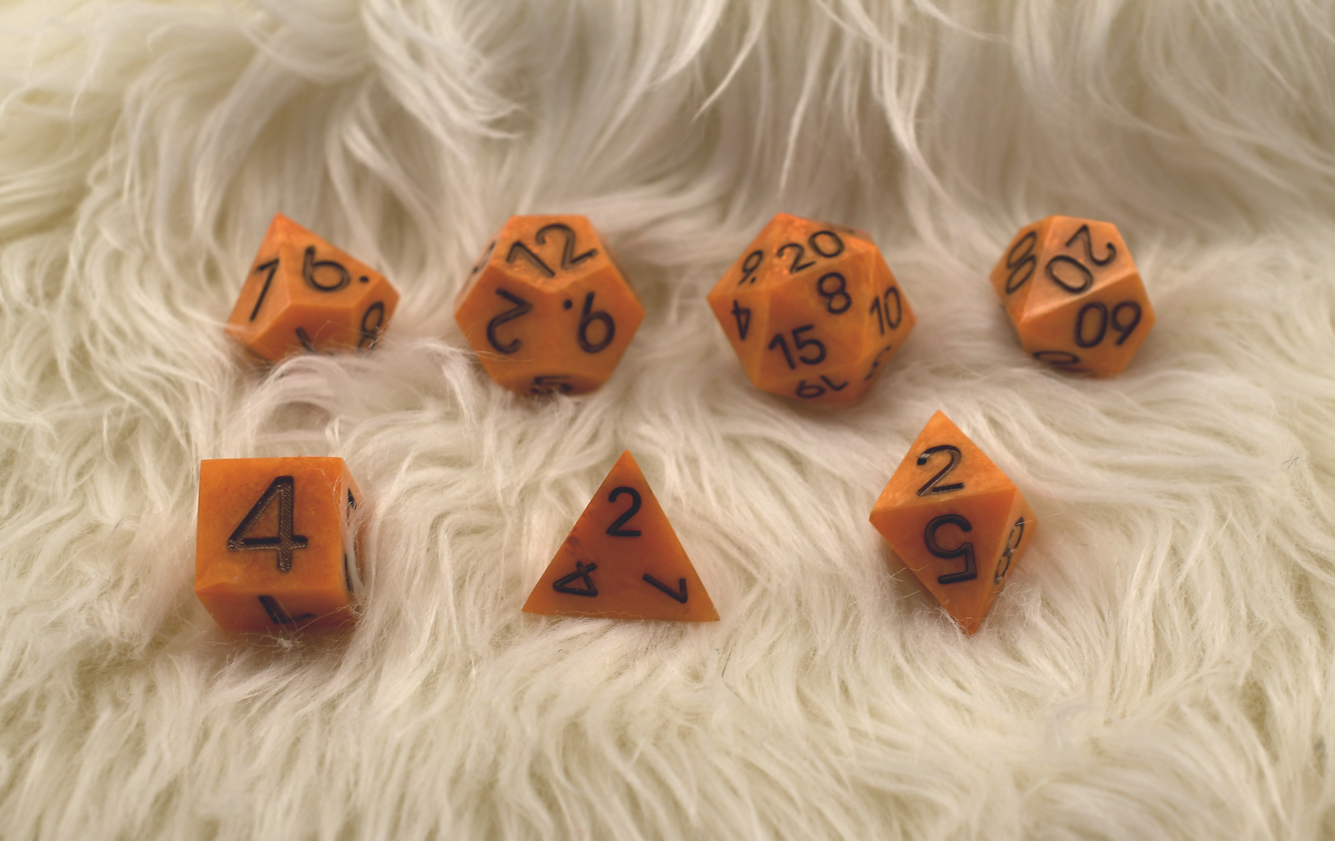 [ID: A set of seven sharp-edged resin dice, colored a textured orange and inked in copper. The dice are displayed on ivory faux fur. /ID]