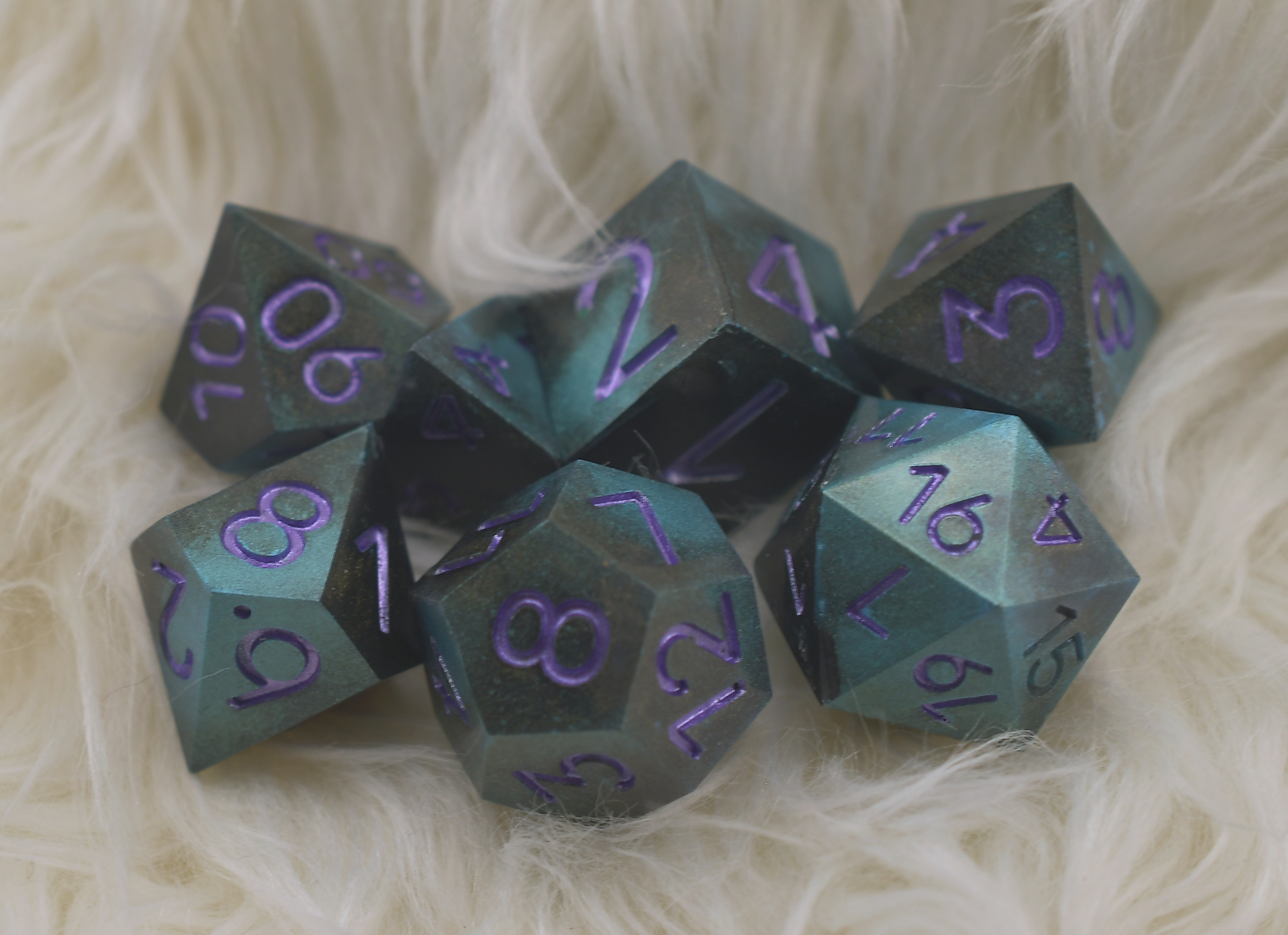 I was experimenting with brushing mica powder in my dice molds, and this is what came out. I think it looks cool, but I'd also like to try this at some point with some light-colored resin, just to see how it would come out. Available here: https://ko-fi.com/s/c6f9ab4b62 [ID: A set of seven sharp-edged resin dice, colored black with splotches of metallic dull blue and inked in metallic purple. The dice are displayed against a backdrop of ivory faux fur. /ID]