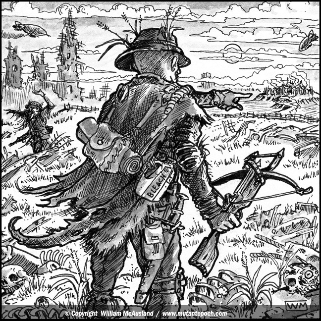 Scavenger: While normally loners who live on the edge of vast ruined cities, or among the wrecks of former battlefields and industrial zones, scavengers are commonly encountered by excavators and nomadic traders, who will barter with these wasteland hermits. Typically, scavengers will trade important information about a local stretch of ruins or road in return for food, tobacco, marijuana or booze. On some occasions, travelers might discover that the scavenger has a mate, and one or more children. These kids grow up to be resourceful, half wild things themselves, but because of their exposure to dig teams, many develop an obsession with both the caste of diggers and the distant towns and barter forts the ruin looters come from. Art from page 18 of The Mutant Epoch RPG Expansion Rules pre-game caste section. https://www.outlandarts.com/expansionrules.htm