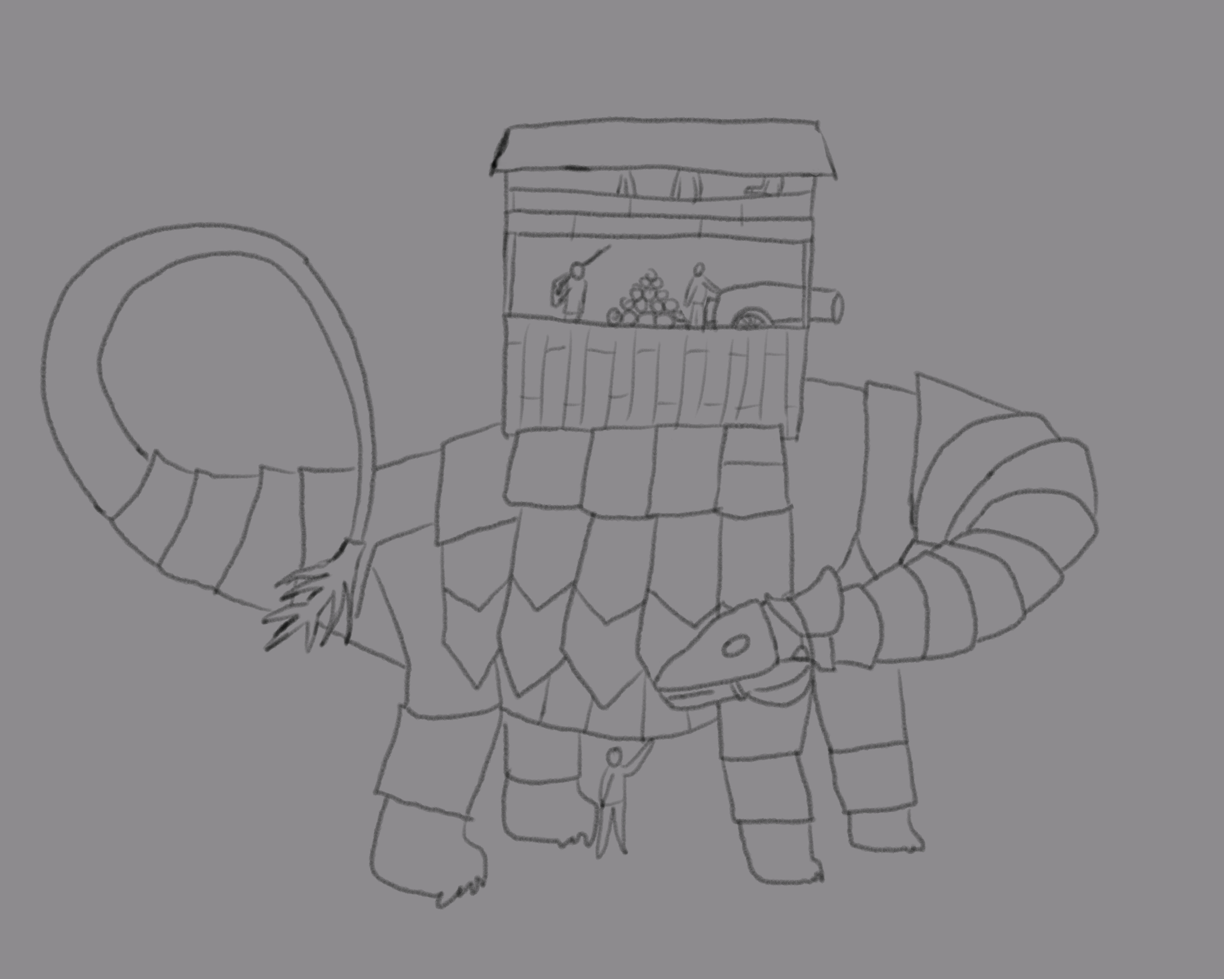 [ID: A digital sketch of a diplodocus wearing plate armor. There's a barbed weapon fixed to the end of its tail, a saddle on its neck behind its head, and it's wearing a small building with a cannon, two people, and a stack of cannonballs on the bottom floor and three people on the top floor. On the ground there is yet another person, reaching up to the dinosaur's head. /ID]