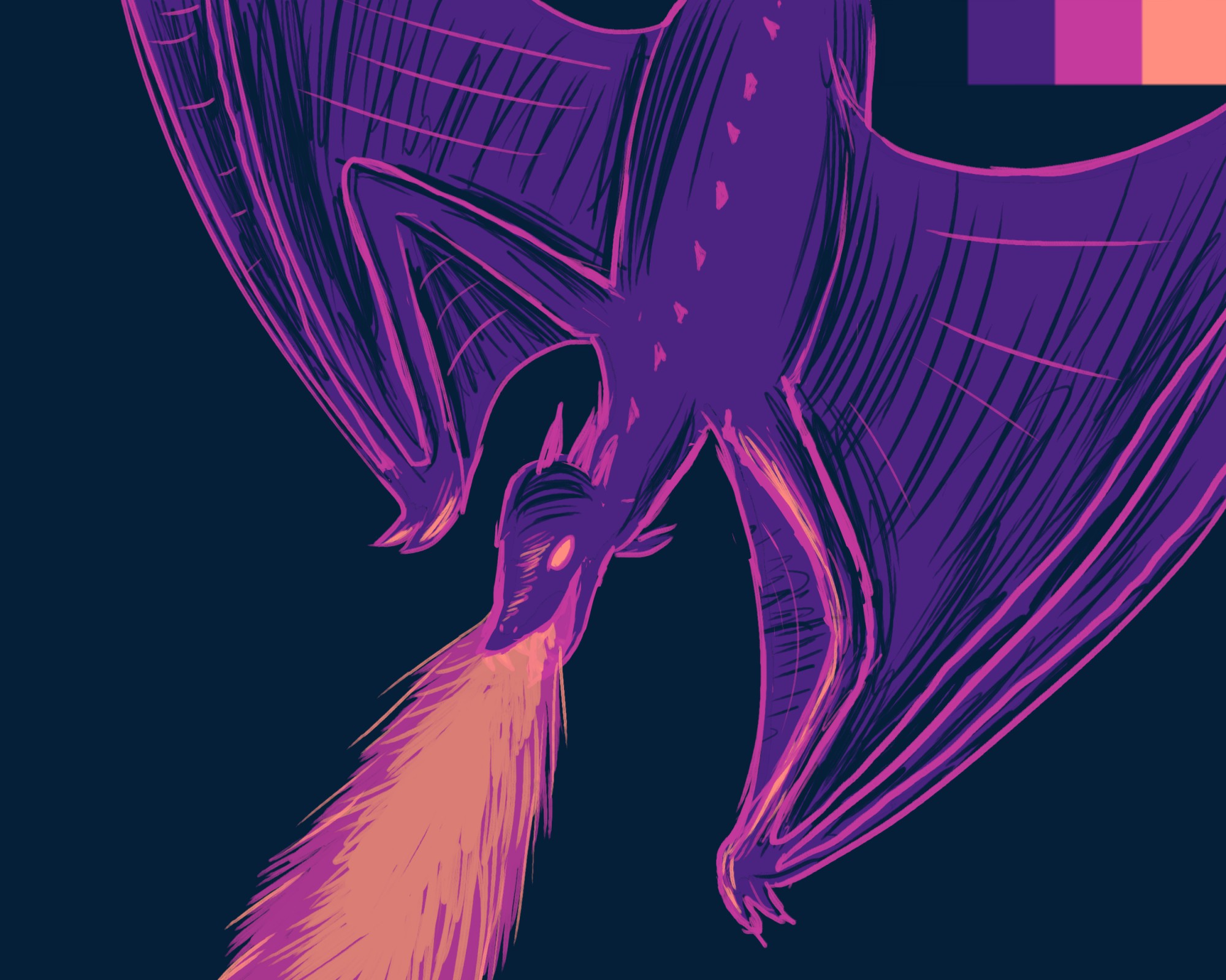 [ID: A jakapil dinosaur crossed with a dragon, drawn in peach, pink, purple, and navy blue and breathing fire. /ID]