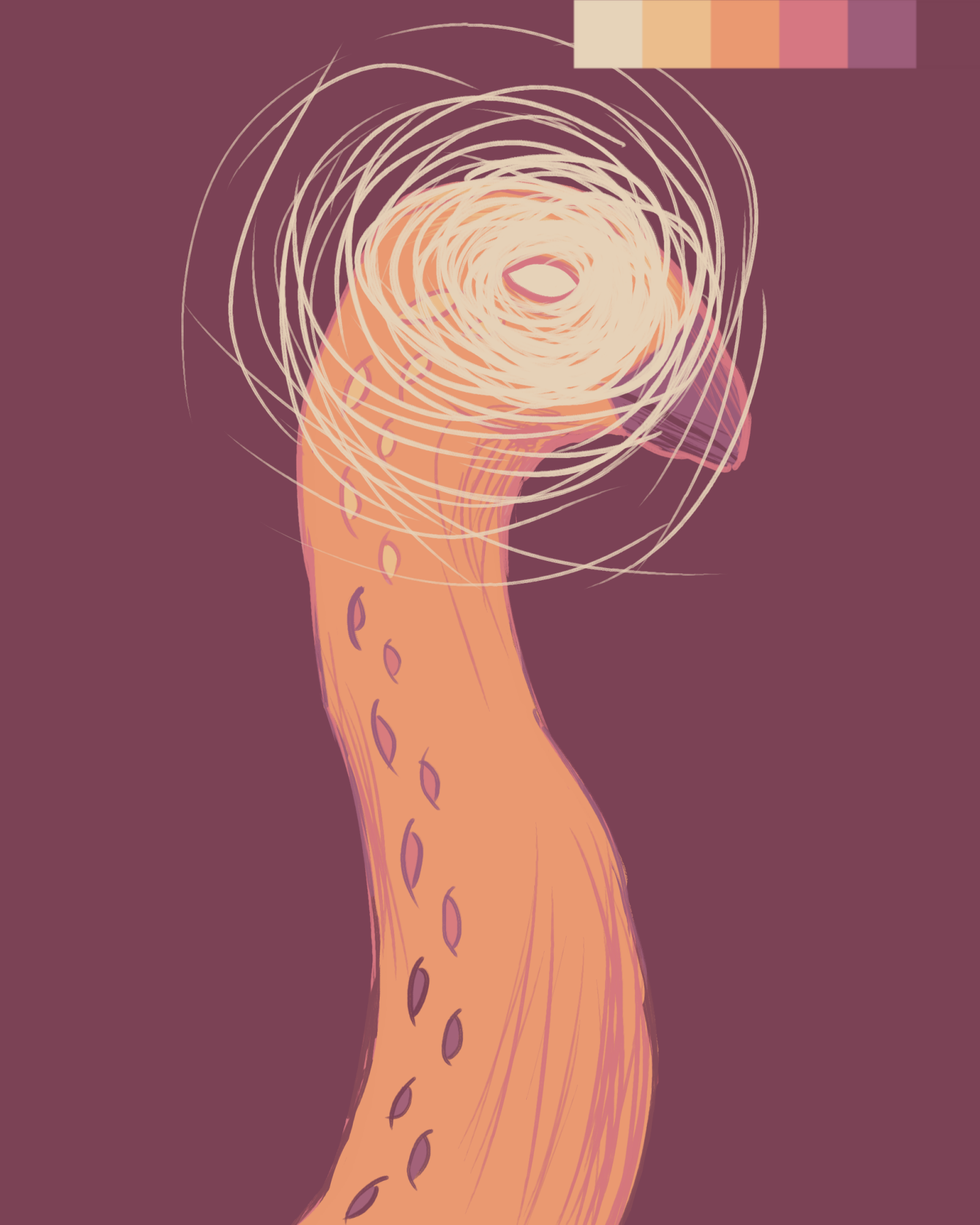 [ID: A sketch of avivimimus in dull shades of orange, red, and yellow.  The dinosaur is depicted from the neck up, and has a line of eyes running up its neck, with the final eye blowing. /ID]