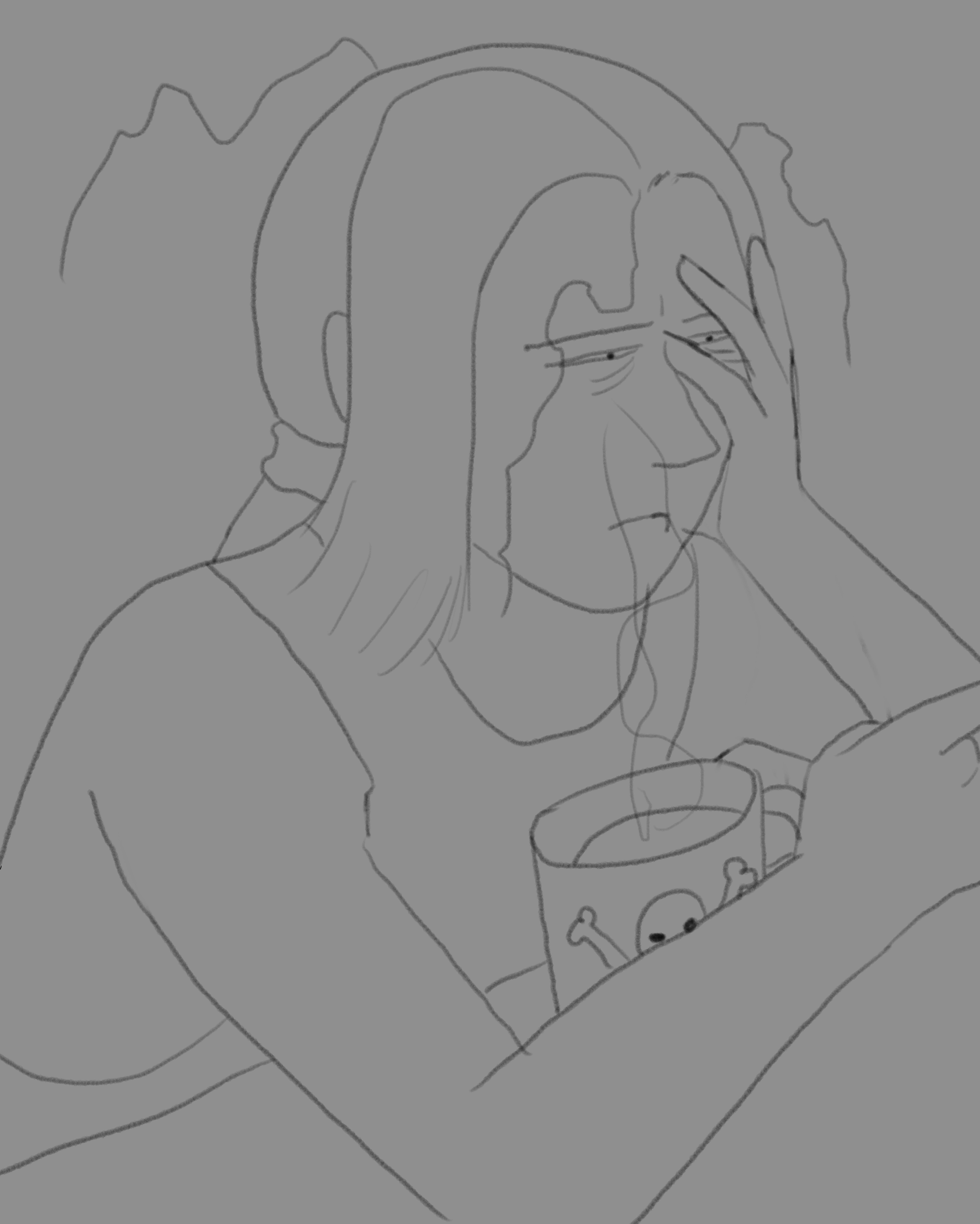 I didn't intend to draw more fanart yet today, but someone mentioned Yuan needing his coffee and oops my finger slipped. (it's not a very good doodle but it amused me so there) I'm pretty sure after being alive for 4000 years your coffee would have to be borderline toxic, because mine sure as hell would have to be lol. [ID: A digital sketch of Yuan Ka-Fai from Tales of Symphonia hunched over a steaming mug of coffee with a skull and crossbones visible on the mug. Yuan is squinting unhappily. /ID]