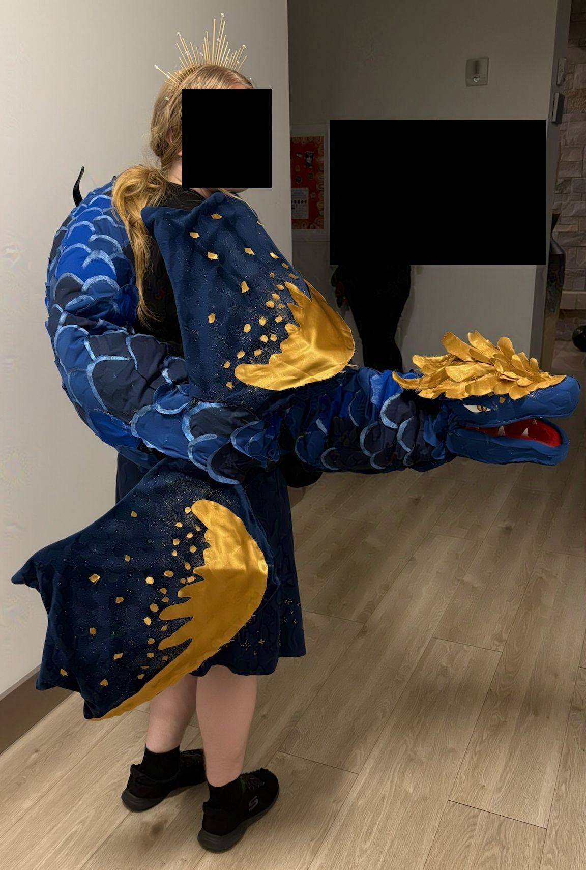 • Photo from the back of a woman operating a blue dragon puppet. It has layered fabric scales with metallic paint on the tips The wings have gold glitter and a piece of gold fabric along the top edges. One top of the head is a crest of feathers made of the same gold fabric. It has yellow eyes and pointed teeth. The woman wears a dark blue dress with stars embroidered along the bottom, and a halo-like crown.