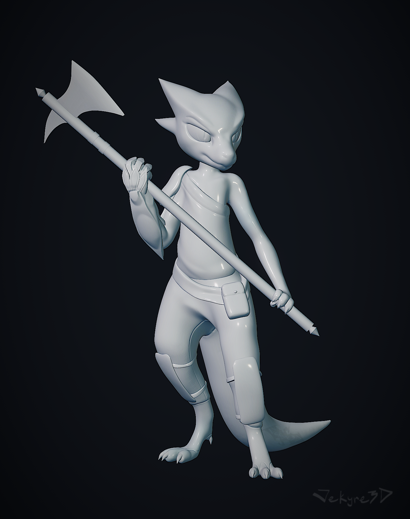 Commission for a client! It was for a 3D printable STL, hence no color. About Nyx: "Kobolds are usually isolationist, living their whole life in their hidden caves, happily mining away. Kobolds have a belief that to die in service defending the tribe will lead to them being reborn as a kobold again, and someday, a dragon. But to die selfishly, aka not in defense of the tribe, will see your soul cast away, never to be seen again. This Kobold, Nyx, is in a wierd predicament. She did fight in the defense of her tribe, but was knocked out in the fight...and lived. Her tribe did not. So now she's in a logic puzzle. If she dies now, will she be reborn when her tribe is no more? She doesn't know where any other tribes are, not that they would likely accept her, so she's come to the conclusion that the only way to redeem herself is to hunt down those who killed her tribe, and kill them or die trying. Nyx began hunting those who killed her tribe. During this search, she encountered a dwarf and mistook him for the killers. Her attempts to kill him were...laughable. At least to the dwarf. Curiously, he didn't finish her off but brought her back to his clan's home. Dwarves have an appreciation for honor and vengeance, and so he decided to help prepare her. For a year, she lived with them, mining and learning to fight. Finally, a year later she left to search for the killers, as skilled as the dwarves could train her in the art of tracking, fighting, and survival. The Dwarves even equipped her with a light chain main that was so fine it weighed little and felt more like leather. Weapon wise, they gifted her a light crossbow, and a halberd she had found in an older part of the clan's stronghold. Unlike most kobolds, who have rough skin, and sharp lizard appearances. Nyx is from a softer subtype of kobold that are...cute. Scales are soft and barely noticable from a distance, and she can be mistaken for a dragonkin/humanoid at first." (Description credit goes to my awesome client, Espeon_Nyxcha!)