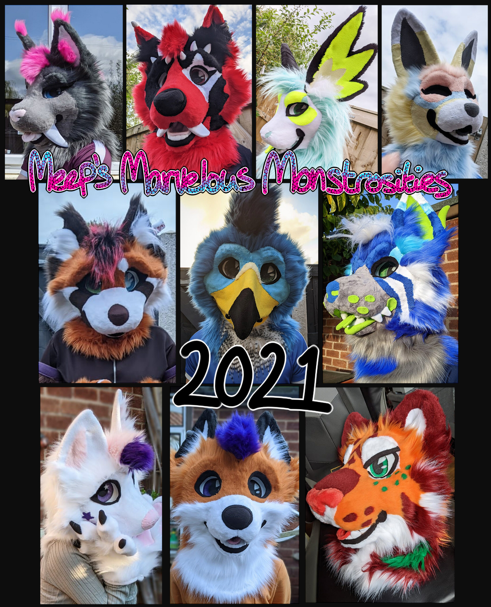 • All the fursuit heads from 2021. The top left across was at the beginning of the year towards the bottom right being at the end of the year.