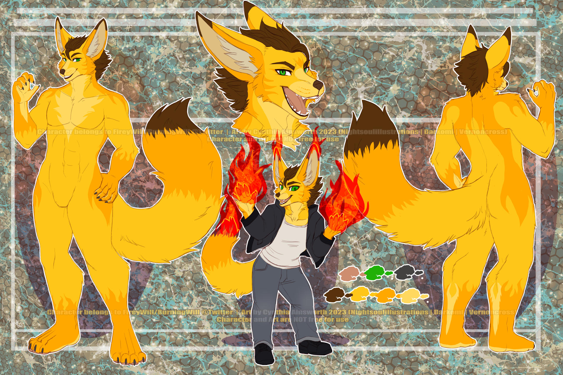 • Reference sheet commission for [FieryWill](https://twitter.com/FireyWill) of his main sona Will, a fire Fennec :3