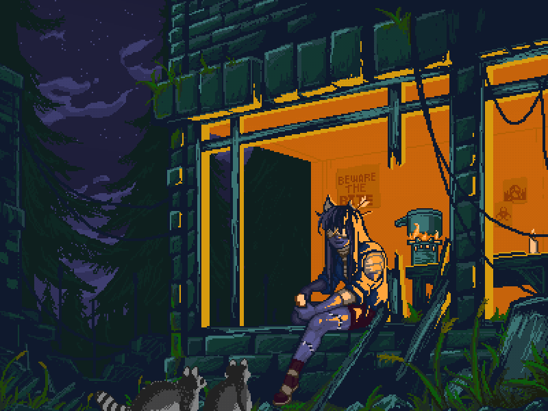 This was just a bit of practice! This is my first time trying to do a landscape in pixel art, and it was a bit of a challenge... but I feel like I learned a lot! -- The zombie girl's name is Karla and she's got quite a following of little scavengers nipping at her heels, but she doesn't seem to mind! While she herself isn't on the menu, she's got plenty of bread that is! Funny thing though, those posters in the background seem to insinuate quite a different story, don't they...?