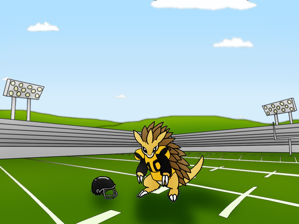 This is a reupload. This artwork was originally uploaded to my gallery on Deviant Art years ago: https://www.deviantart.com/mike-dragon/art/RNo-4-I-m-Ready-2-Play-Now-112995450 Original description below. ------ ------ :star: 1024x768 Click Download for full view. :star: https://nickthesandslash.deviantart.com/ 's request. Is finished! :D He requested me to draw a Sandslash wearing a football outfit, the same he wears in real life. And here it is. :) This is my second attempt at drawing a Sandslash, and since I don't know how to draw it well, I used a official art as refference. I hope I did it right. :) I don't know what was more difficult to draw... The character, or the field. o.o Anyway, it's done now. :) Hope you like Nick! ;) _Sandslash - Pokémon, belongs to Nintendo/Game Freak_