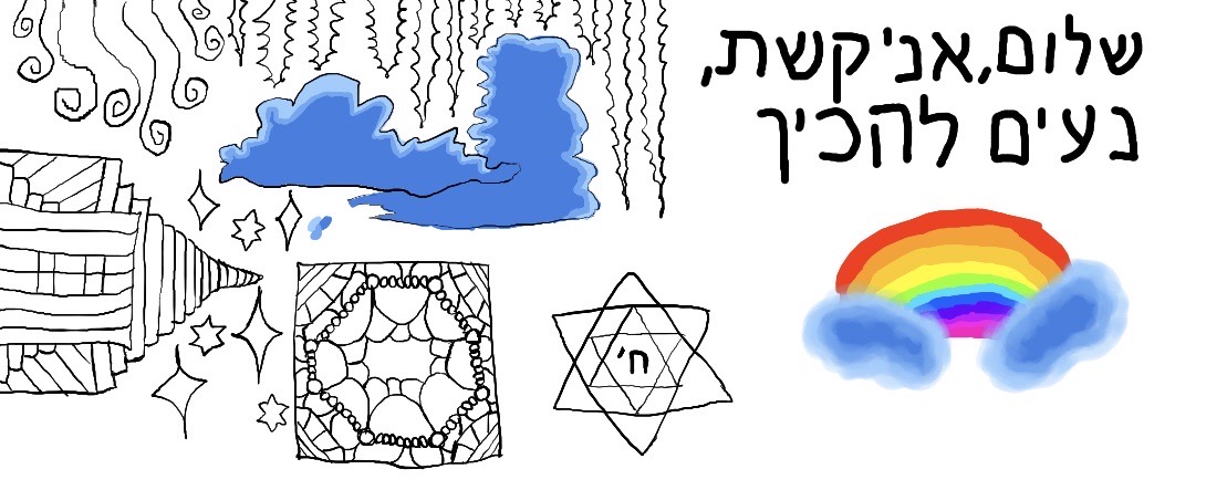 hebrew above the rainbow says “hello, i am keshet, nice to meet you”, the hebrew in the stars says “life”
