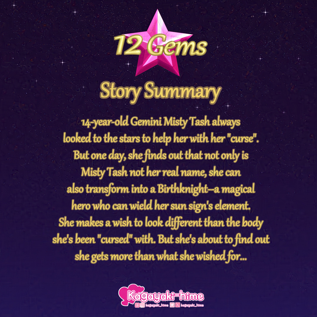 If you need a voice reader, here’s the summary of my comic, 12 Gems. 14-year old Gemini Misty Tash always looked to the stars to help her with her “curse”. But one day, she finds out that not only is Misty Tash not her real name, she can also transform into a BirthKnight—a magical hero …who can wield her sun sign’s element. She makes a wish to look different than the body she’s been “cursed” with. But she’s about to find out she gets more than what she wished for…