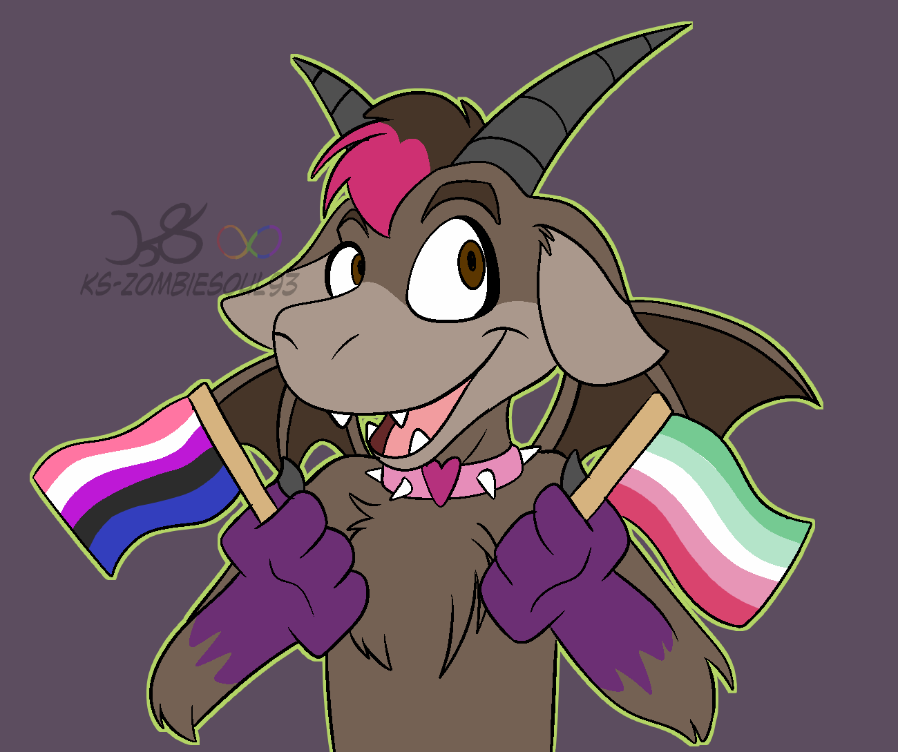 Wanted to share a pic of my sona, Yami, holding up my pride flags! I’m genderfluid and abrosexual 😃