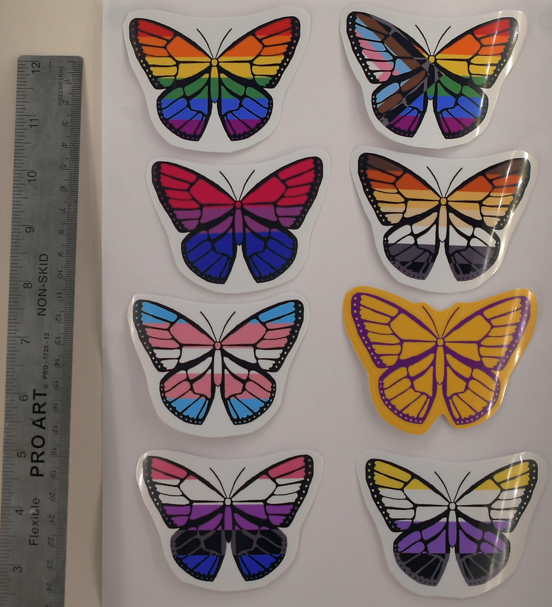 • More pride stickers, these ones in butterfly form. These were a lot of work, especially since I was cutting out all these stickers by hand, but I still love them.