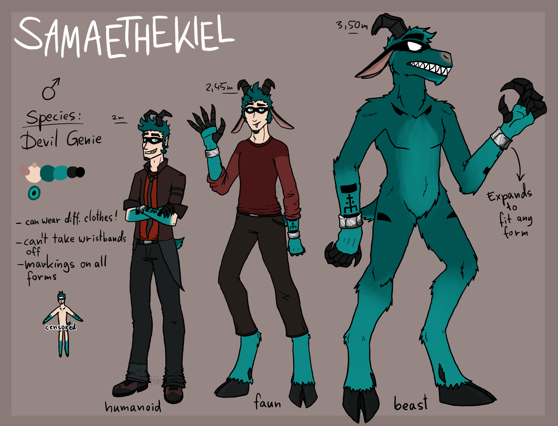 I need to redo this ref one day or I will die in shame Yes he is a devil genie and I asked Cosmind for permission specifically before I made him, like a law abiding citizen https://toyhou.se/215073.samaethekiel