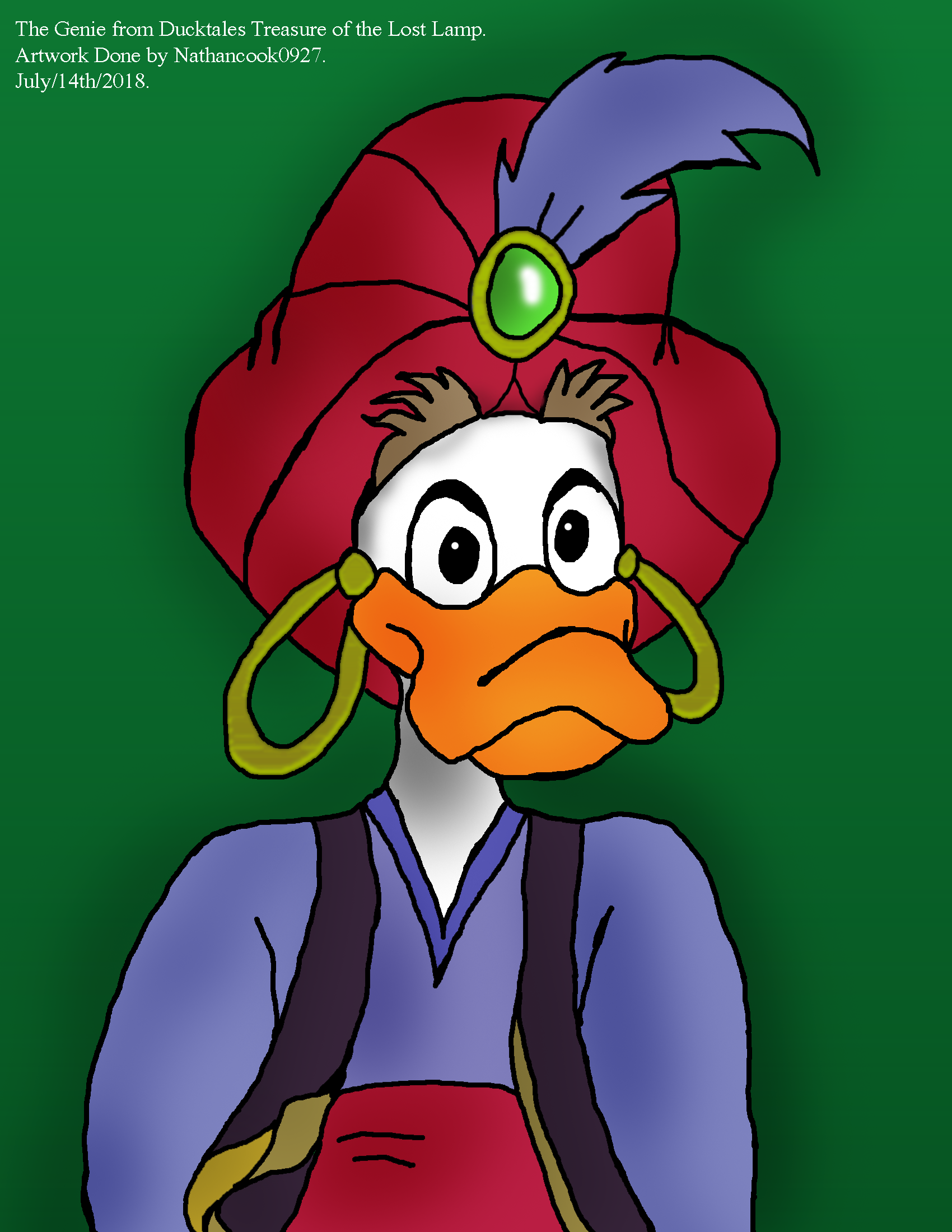 I'd made this Fan Artwork of the Genie from the 1990's Ducktales Treasure of the Lost Lamp back in 2018. What I like about this Genie was that he was fun when he was hanging out with Scrooge's nephews along with Webby but sadly he would be later over shadowed by Robin William's Genie (Now don't get me wrong I like Robin William's Genie) but I do feel sorry for the one from Treasure of the Lost Lamp and I would like to see him make a comeback in the Ducktales Reboot along with his enemy and former exmaster Merlock who will try to regain him for unlimited power. The Genie from Ducktale Treasure of the Lost Lamp Belongs to Disney.