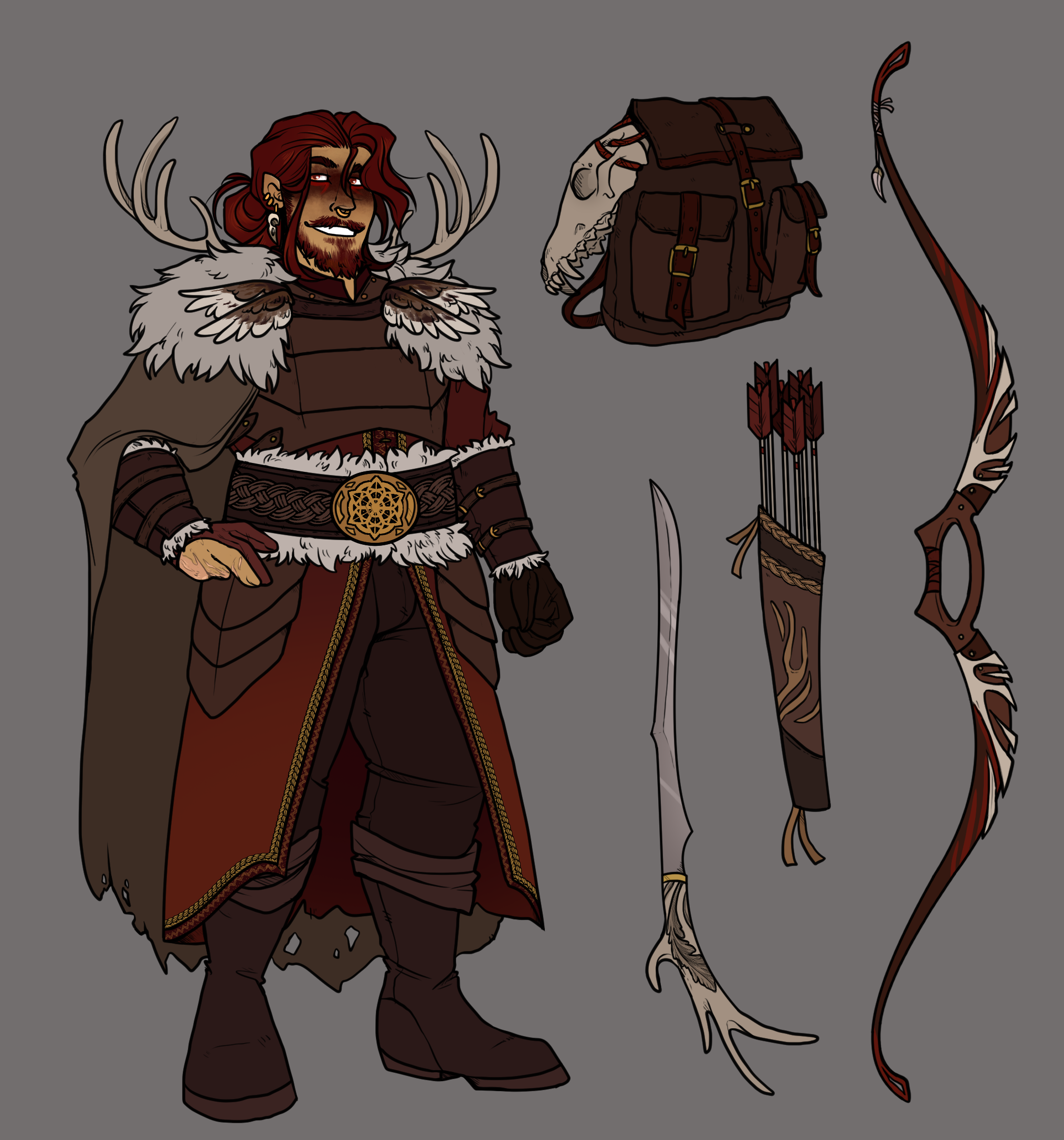 • Hunter Ranger dwarf, high level oneshot PC who I love very very much! He wears his heart on his sleeves and loves company. He tends to get close with anyone who gives him attention, even if the attention comes from malicious sources. Fears no blood and gore and loves to craft ideas no matter how stupid they sound. If it works, it works!