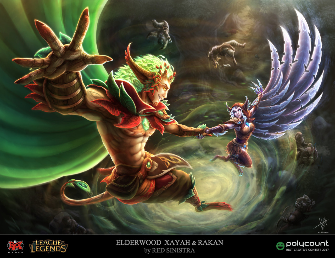 Final Splashart of Elderwood Xayah and Rakan , for Riot Creative Contest 2017. I know, Is so sosososo old, but I still like it and I'm uploading some old art here just in case everything explodes. I like having a Gallery :) Forum Thread: http://polycount.com/discussion/194149/riot-art-contest-2017-forest-guardians-elderwood-rakan-and-xayah-final Xayah 3D Model done by Ke Syu. This is amazingly done. https://www.artstation.com/artwork/D5dRZO