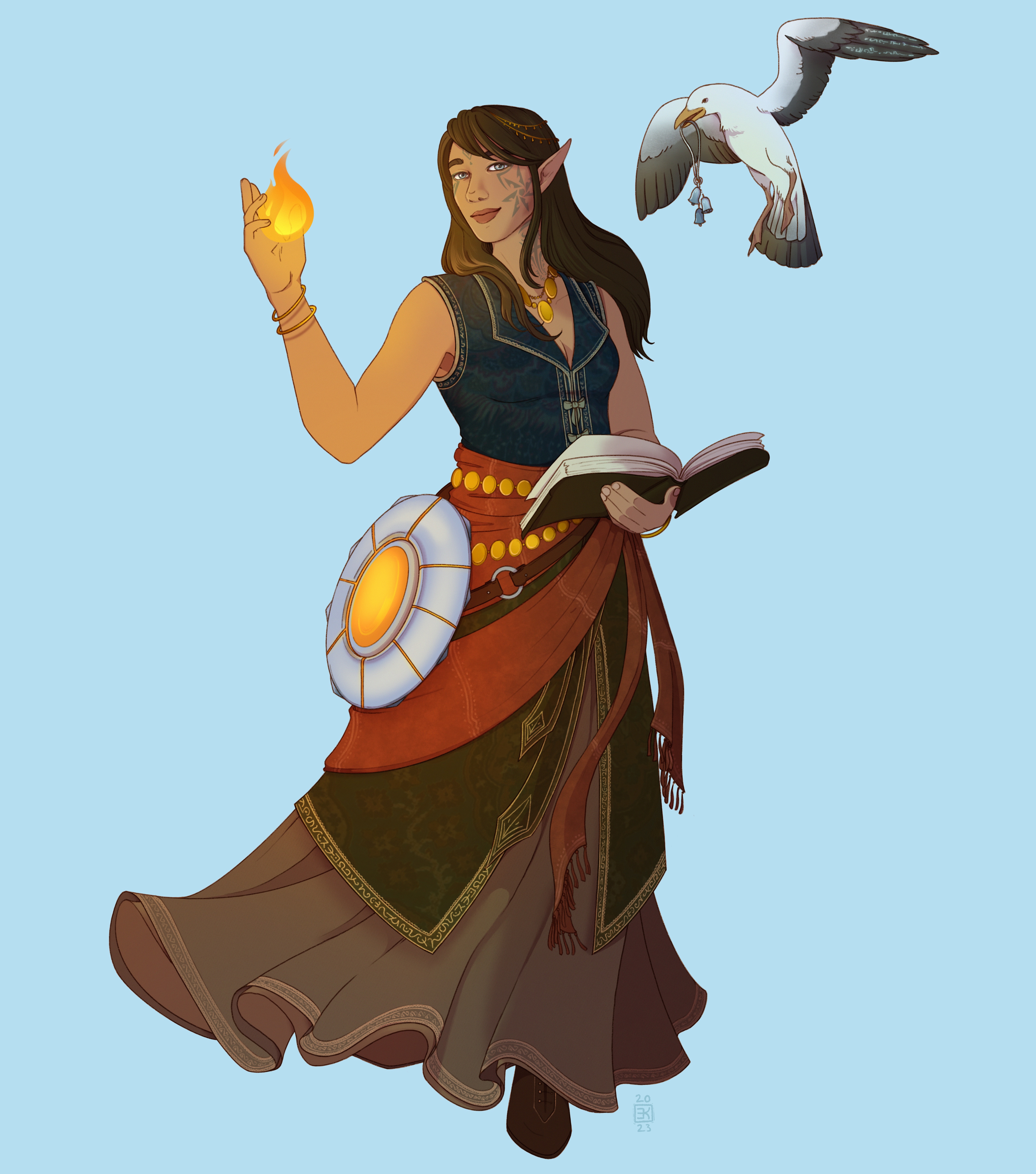 Commission work for Tom & his Pathfinder party! This is Liana, a half-elven Varisian spell sage wizard (and her cyphergull familiar)!