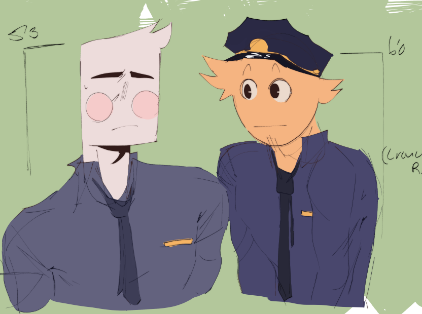 The short one on the left is a raging psychopath who uses his power as a cop to hurt people The tall dude on the right is super naive and gullible and follows along with the short one bc he genuinely thinks they're doing the right thing Probably never gonna draw them ever again after this